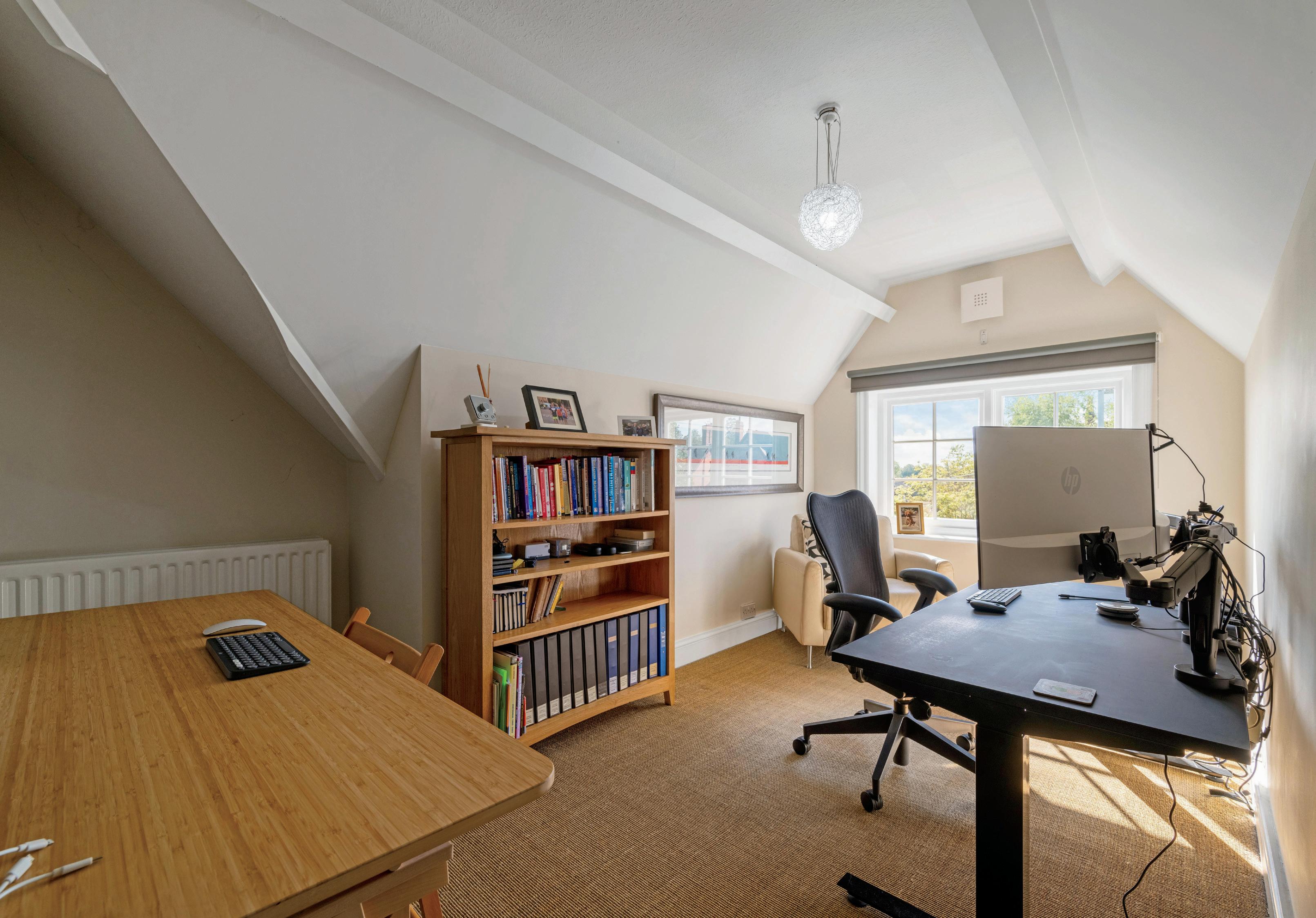The second floor provides access to 3 more spacious double bedrooms perfect for a growing family or those that work from home. Bedroom seven is situated at the front with double glazed small pane window overlooking the frontage, currently used as a work from home office. Bedroom five is a double room with front views and access to an ensuite shower room with separate shower cubicle, wash basin and low-level WC, together with integrated shelving for towel storage. Bedroom six has views of the rear, access to some eave storage space and a laminate floor, currently used as another work from home office. The landing has access to the remaining loft space.