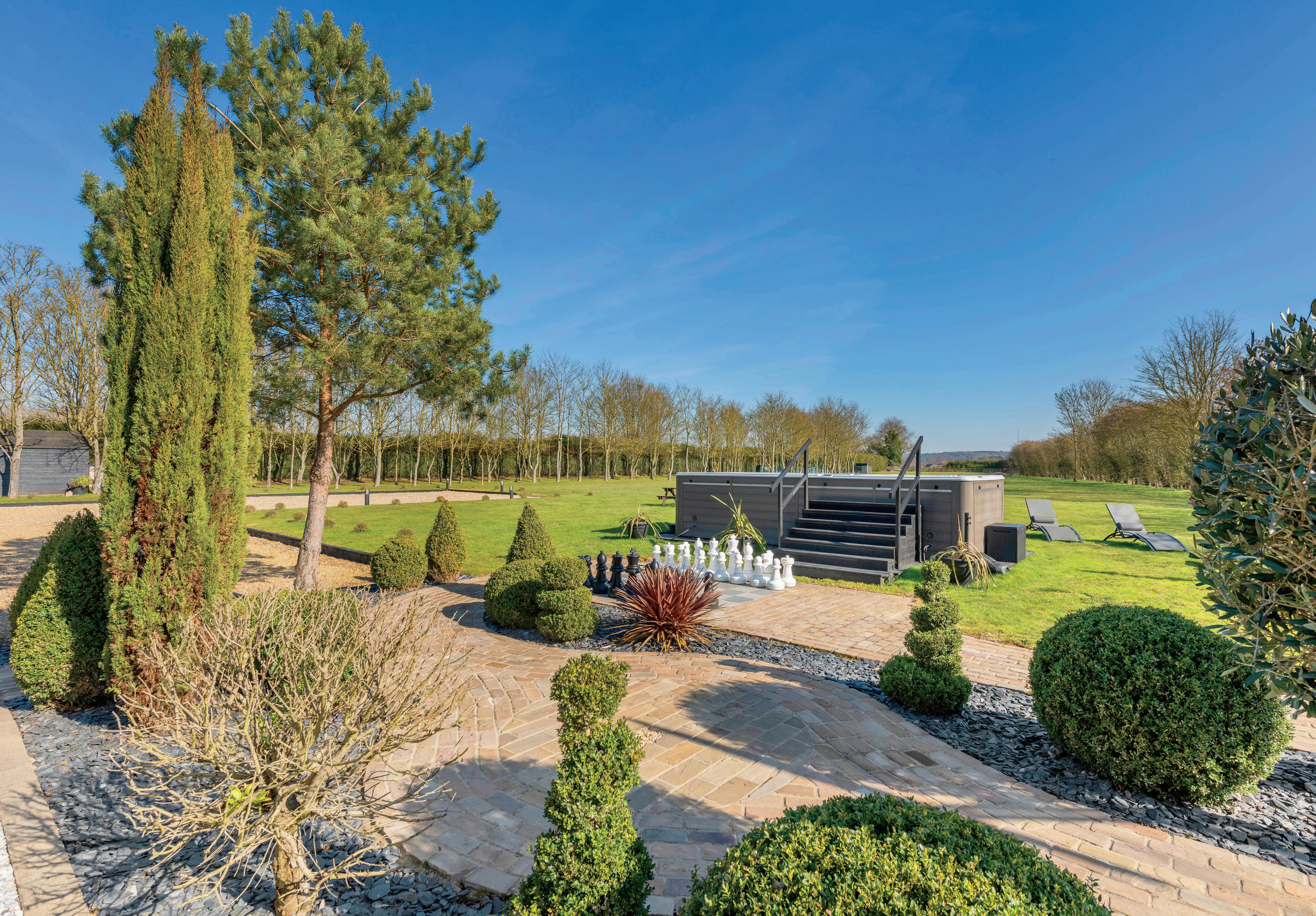 The bungalow enjoys two private patio areas, ornate paving and pathways, and manicured lawns with wellstocked borders, ensuring the outdoor space is just as impressive as the interior.