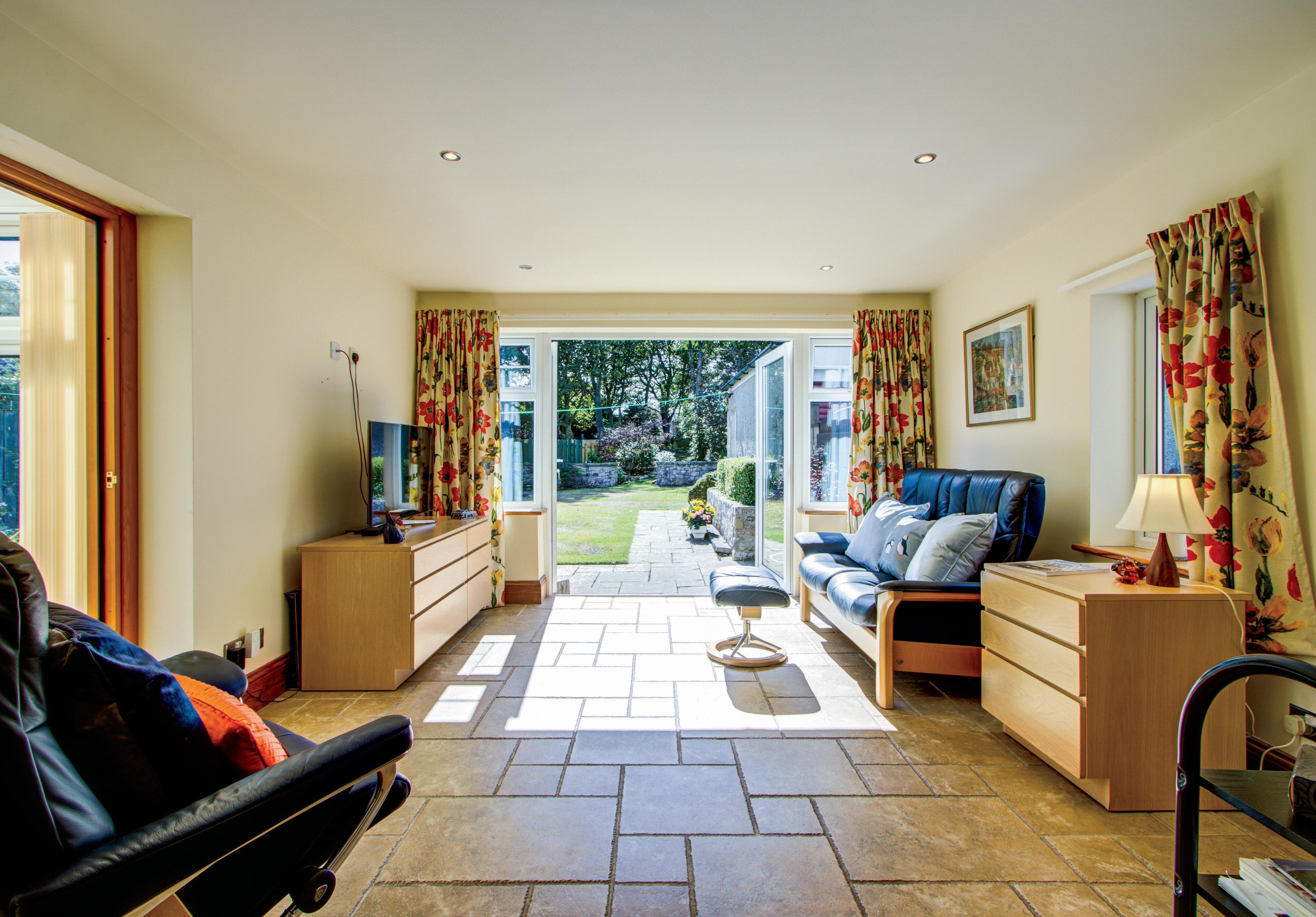 Outside, the generous gardens are an absolute delight. With manicured lawns and pretty borders to the front, and a patio, lawns and mature trees to the rear, this wonderful outdoor space extends to approximately half an acre. There’s plenty of room for entertaining, al fresco dining, or simply relaxing with a book while listening to the sea.