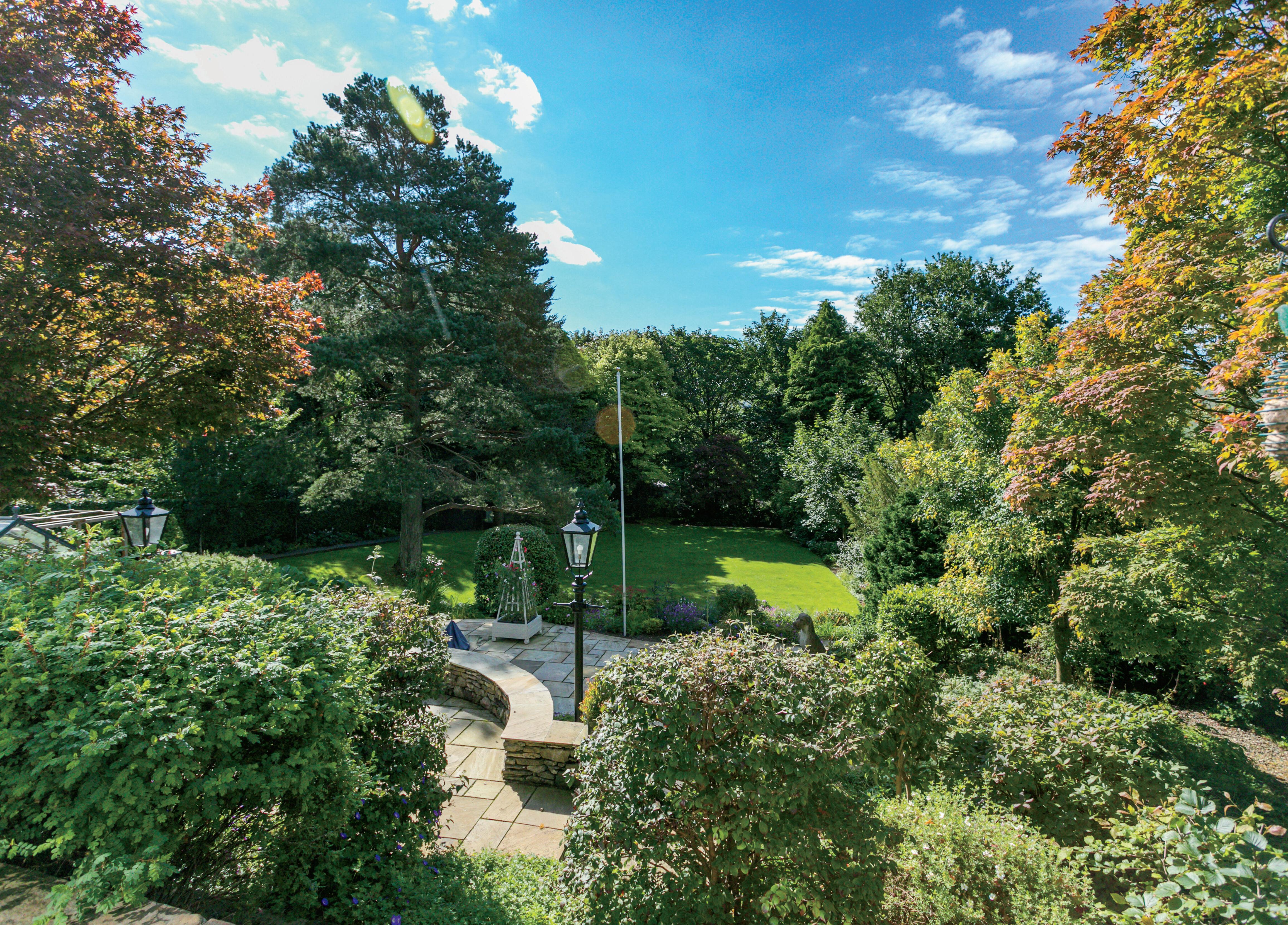 The main garden offers a succession of sandstone flagged seating terraces punctuated by low stone walls with inset stone troughs, well-tended and stocked herbaceous planted beds with a multitude of flowering shrubs, roses and acers and connected by both a gentle ramp (designed for wheelbarrow access) and a semicircular flight of stone steps.