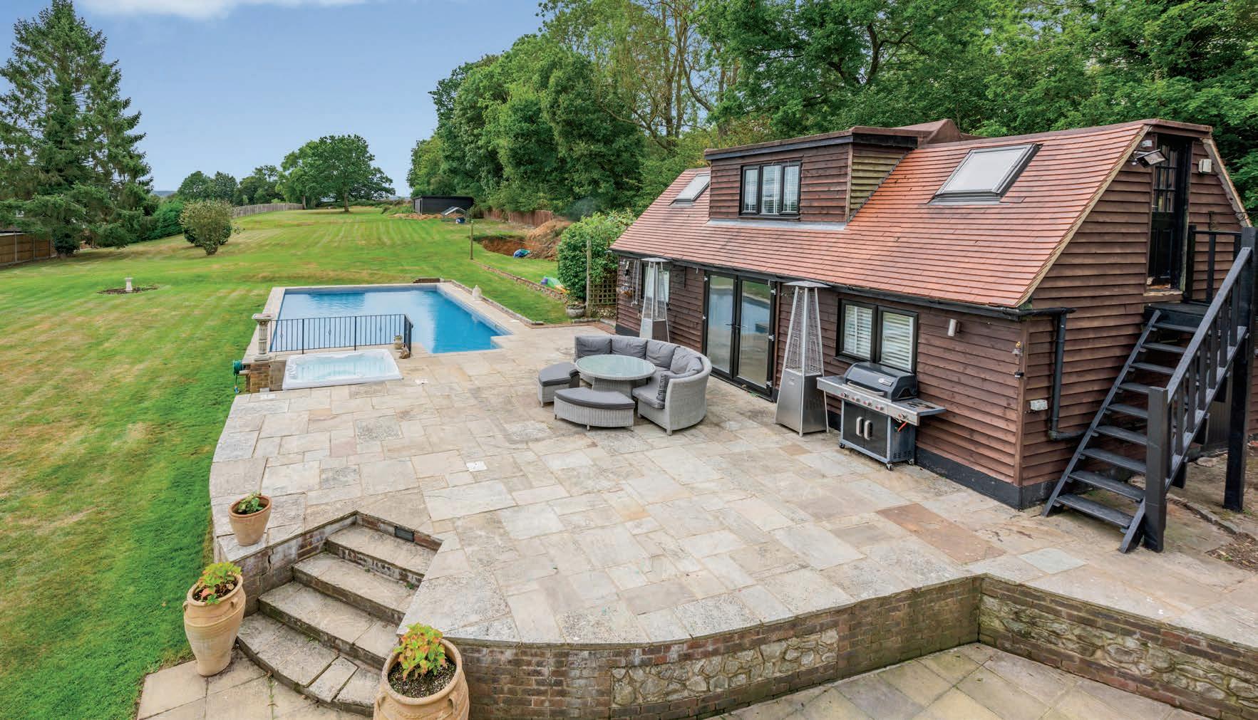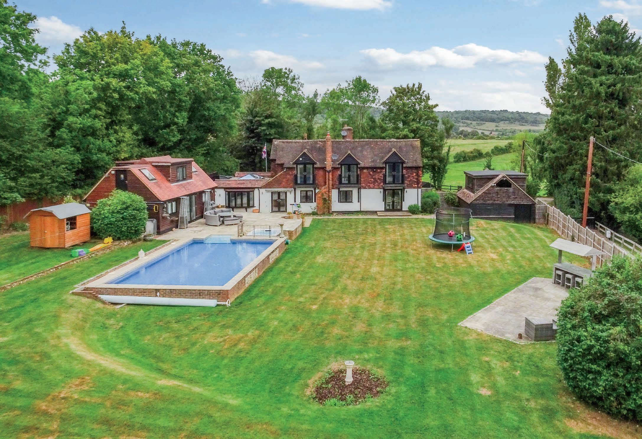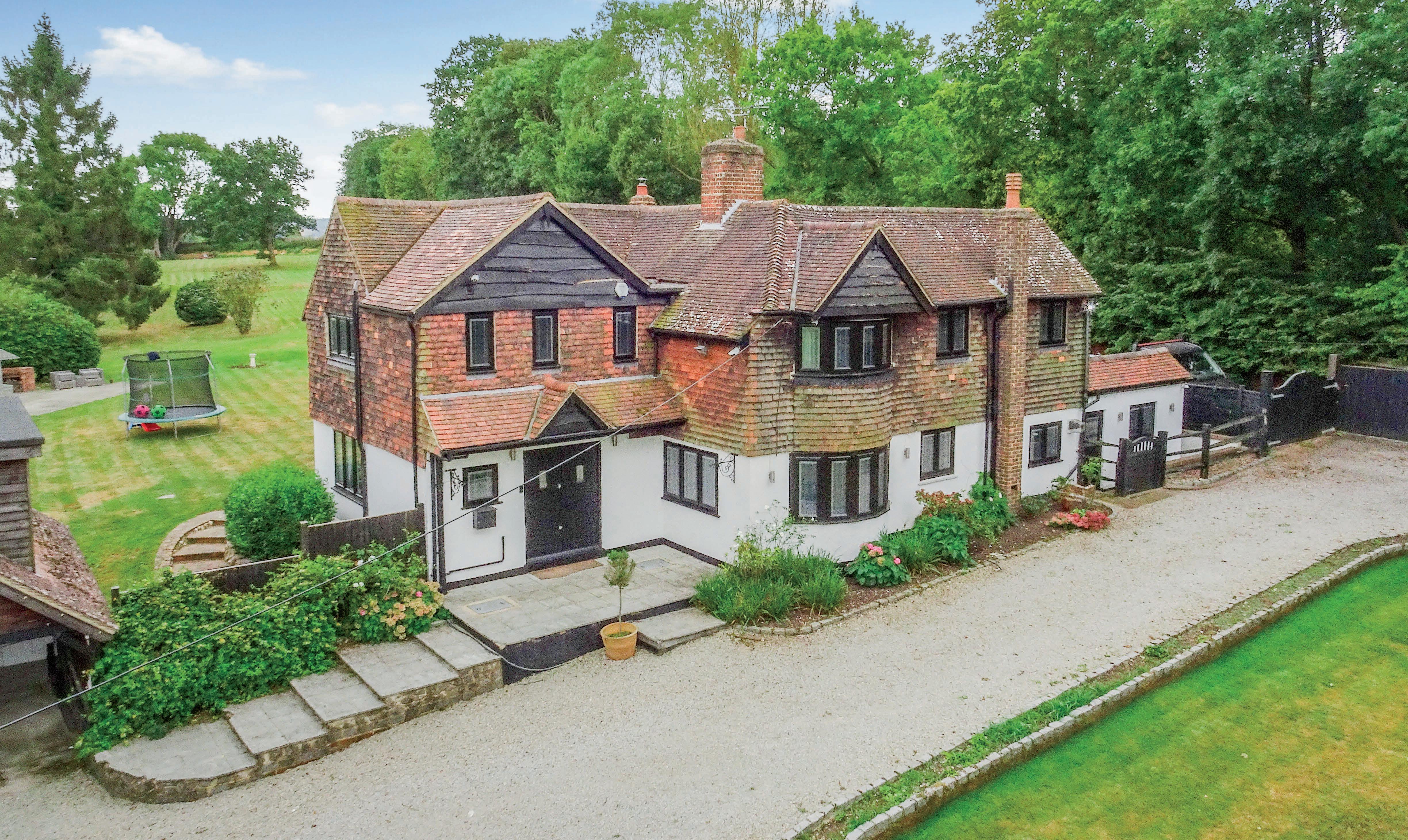 On a 2.7 acre plot in Otford and at the end of Telston Lane, this characterful home has a variety of architectural detailing, balconies from three of the bedrooms to the rear with amazing views, two en suite bathrooms, a dressing room and a family bathroom upstairs