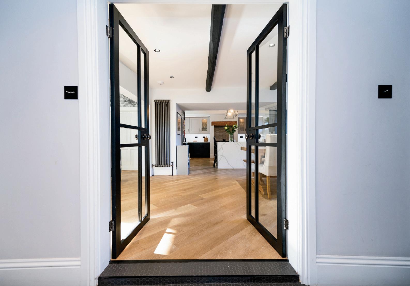 An entrance door with feature Portico over opens to the reception hall which has traditionally styled tiling to the floor, provides an impressive introduction to the property and is complimented by a high ceiling height which continues throughout the property. Features include a traditional cast iron radiator, deep skirting boards, coving to the ceiling and a cantilevered staircase which rises to the first floor level. The hallway has a secondary staircase with cloaks area at the base, provides access to cellar, and W.C before twin Crittall styled doors open to reveal the living kitchen.