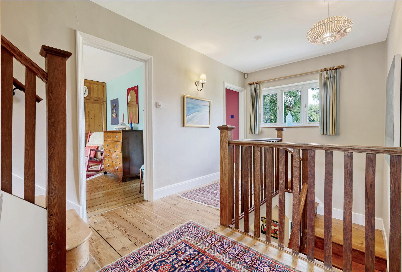 On the first floor, the impressive 22ft principal bedroom features a spacious en-suite bathroom with a separate shower. The second bedroom benefits from bespoke handmade wardrobes, while two further bedrooms are served by a generously proportioned family bathroom. Stairs lead up to the second-floor bedroom/study, providing a secluded space ideal for working from home or accommodating visiting guests.