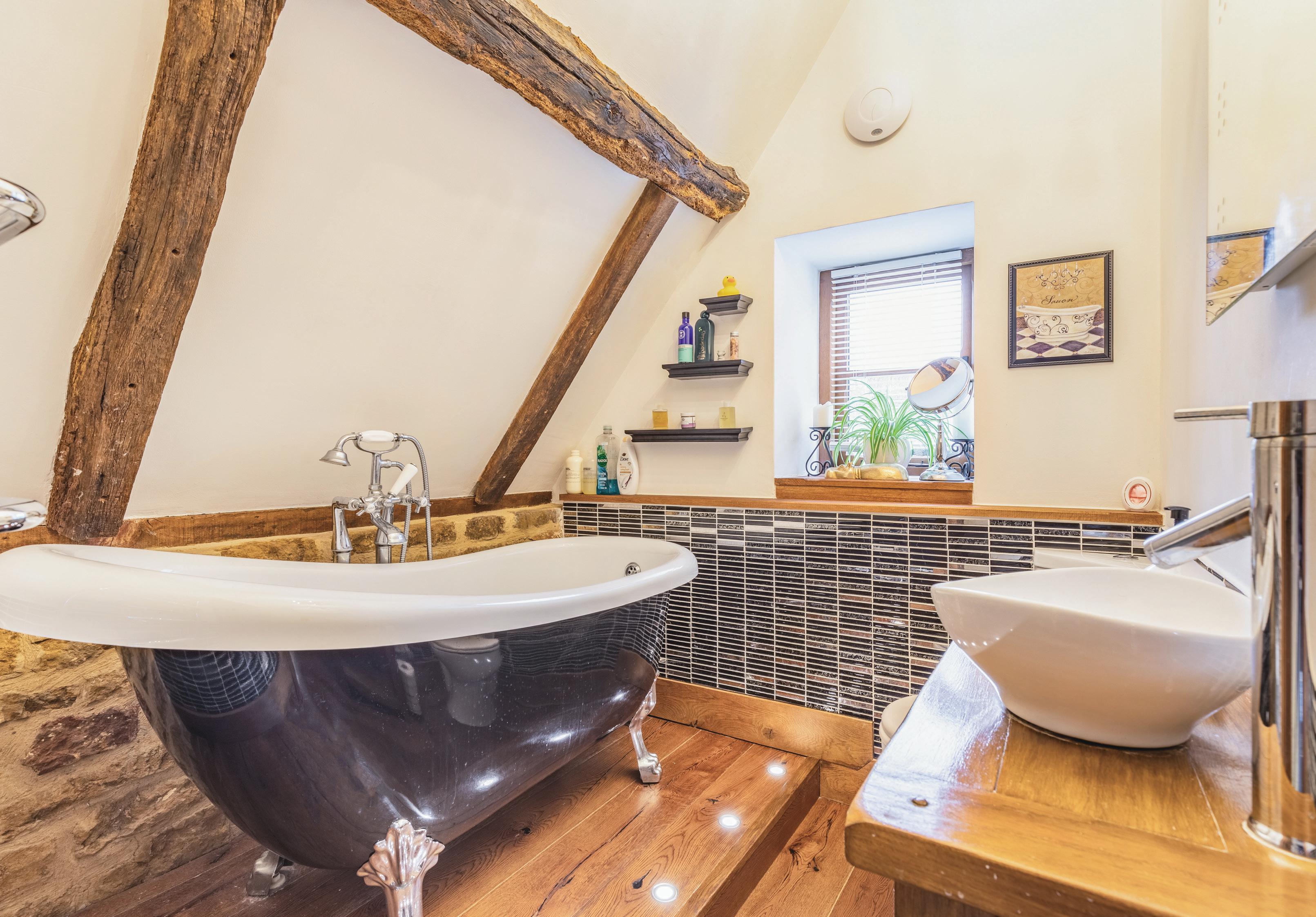 The landing has down lighters with an airing cupboard housing the fully lagged hot water cylinder. The double bedroom is a stunning room with a high vaulted ceiling with track lighting and an ornamental hatch door, radiator, exposed beams and king-post, fully exposed full height stone wall, front and rear windows. The single bedroom has a radiator and a high ceiling with dual aspect windows. The bathroom features a period slipper style bath with mixer taps and a showerhead attachment. Low-level WC, oak vanity unit with inset wash-hand basin, radiator, exposed stonework and beams, window.
