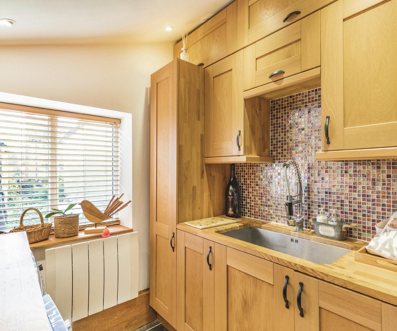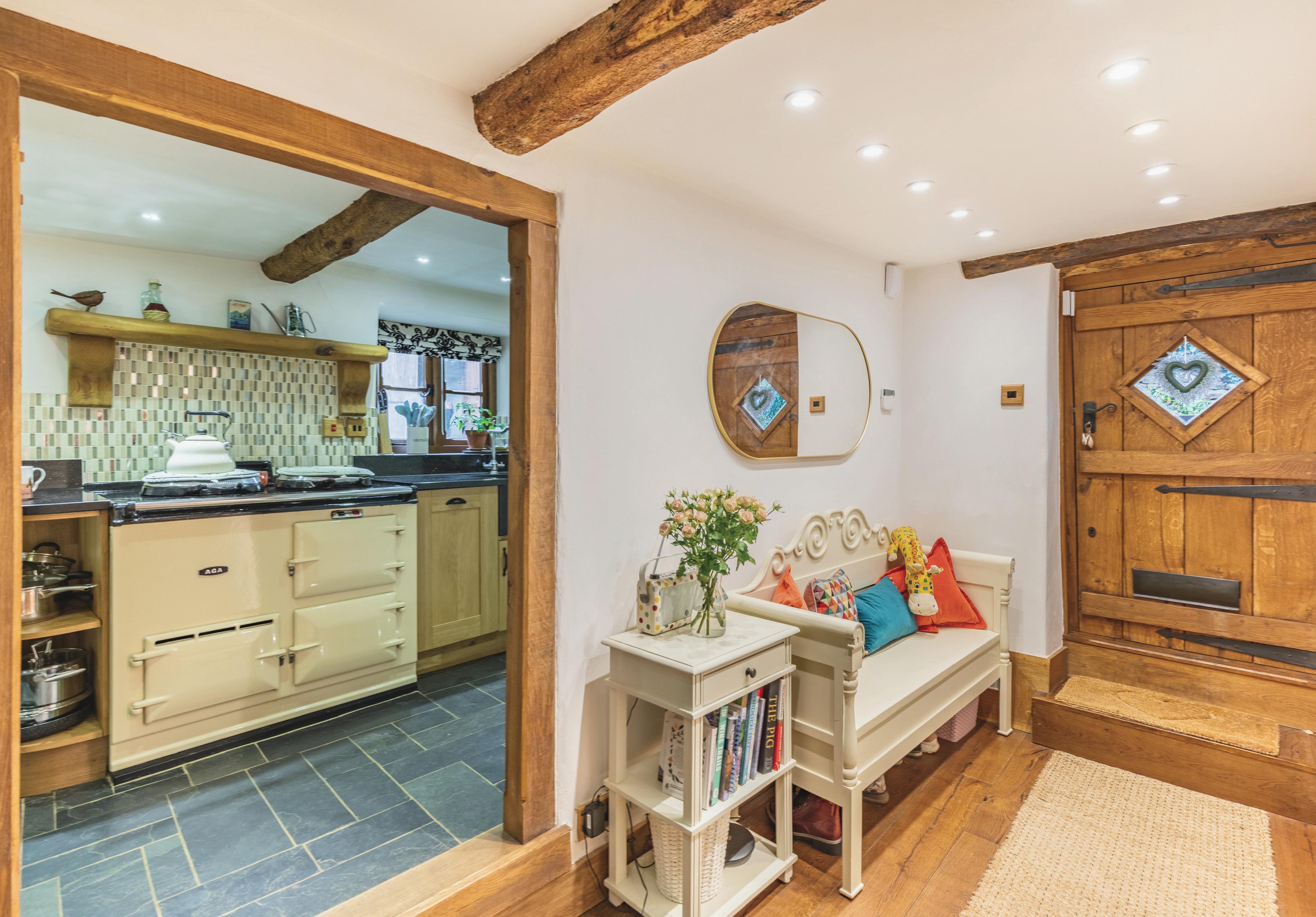 A handsome solid oak front door opens to the spacious entrance hall. A spiral staircase gently rises to the first floor, under stairs storage cupboard houses the alarm control panel and RCD consumer unit. Oak flooring, step up to the kitchen and a bespoke oak door to the cosy lounge. A fine Inglenook operational fireplace with inset lighting and power warms the room with an oak beam above and a large original bread oven. Oak flooring, TV point, ceiling beams, front and rear windows with seats beneath.