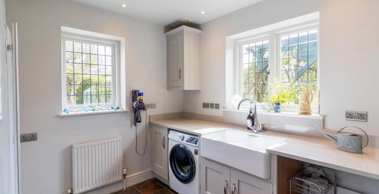 Conveniently located off the kitchen are the boot room and separate laundry room. The ample space in the boot room ensures that there is plenty of room for the entire family’s outdoor gear, keeping everything organised and easily accessible. The high ceiling, Velux window, and efficient layout make the boot room a functional and stylish space, and its convenient location provides access from the kitchen to the side courtyard, making it a valuable addition to the home. Adjacent to the boot room and featuring the same high specification as the kitchen is the fabulous and practical laundry room. This well-appointed space is designed for efficiency and convenience, equipped with ample tall storage cupboards to keep laundry essentials neatly organised. The room also offers plenty of workspace, a large double Belfast sink with a mixer tap, and space for a washing machine and tumble dryer. Adjacent to the kitchen is a smart guest WC located in the hallway for the convenience of visitors. Additionally, a large cupboard situated at the back of the guest WC provides easy access to the electric and solar panel circuits.