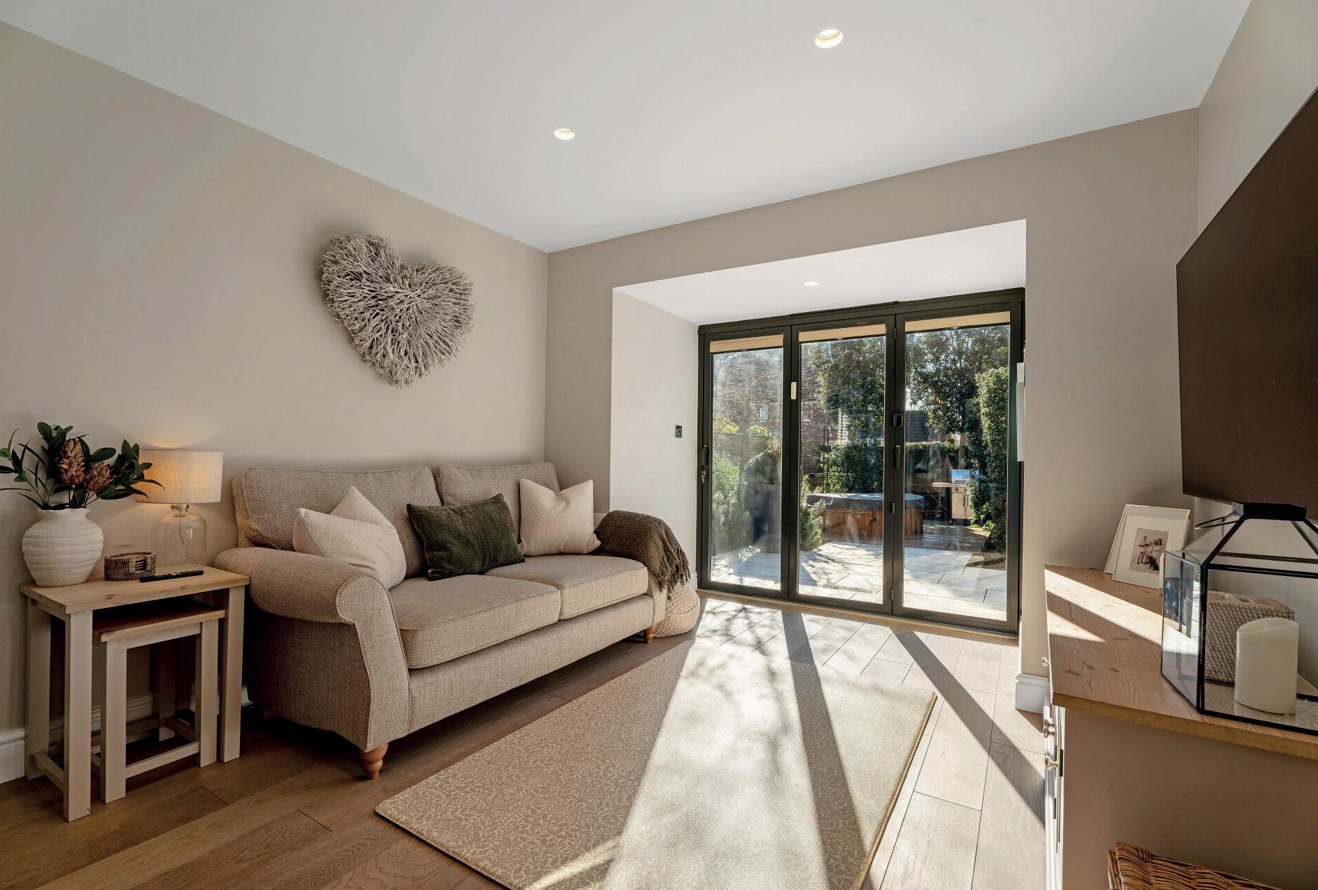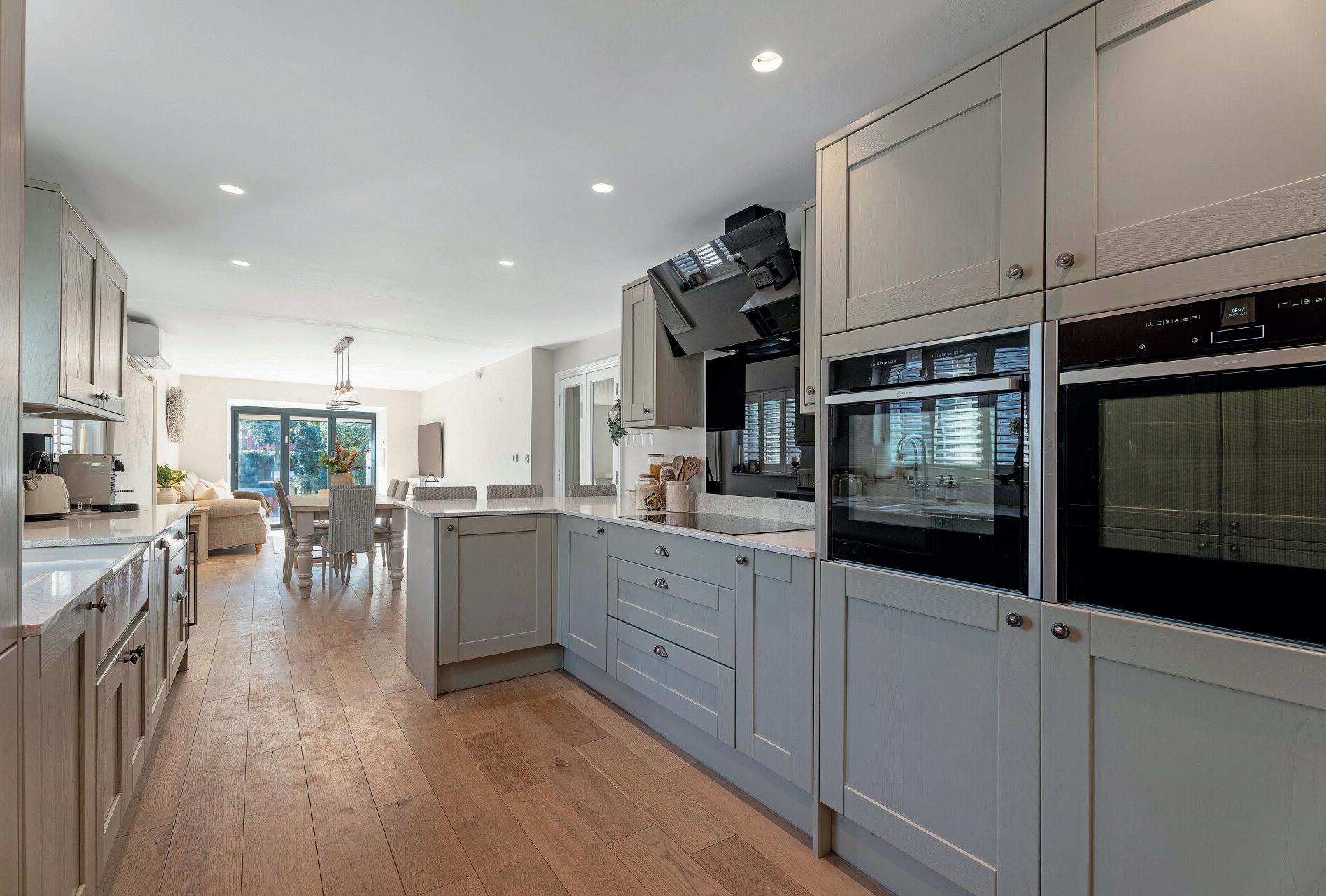 A spacious entrance hall leads into the home’s beautifully appointed living spaces. The heart of the ground floor is the spectacular open-plan kitchen/dining/family room, which opens entirely onto the south-facing garden through full-width bi-folding doors. Designed for entertaining, the kitchen features quartz worktops, bespoke cabinetry, a central island with bar seating, and premium appliances throughout.