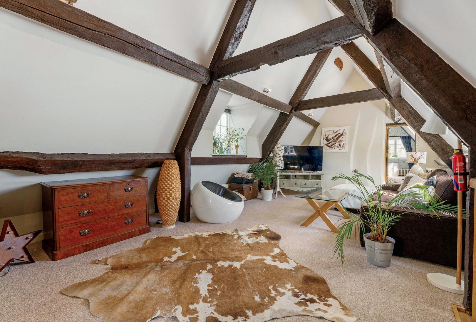 The top floor offers versatile space, including two further bedrooms and a fantastic recreational room, ideal as a media room, playroom, or office space. This level is flooded with character, featuring vaulted ceilings and exposed beams throughout.