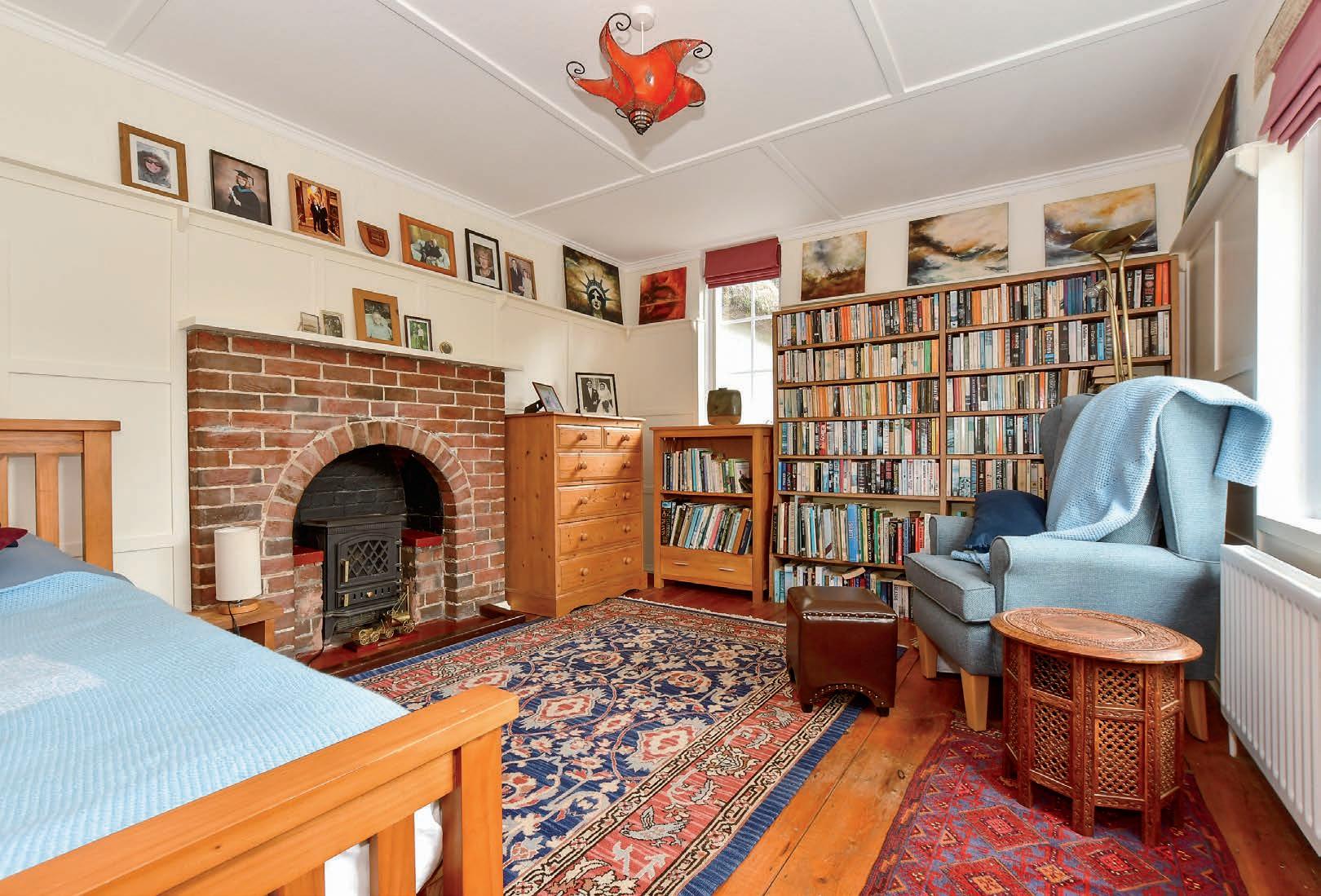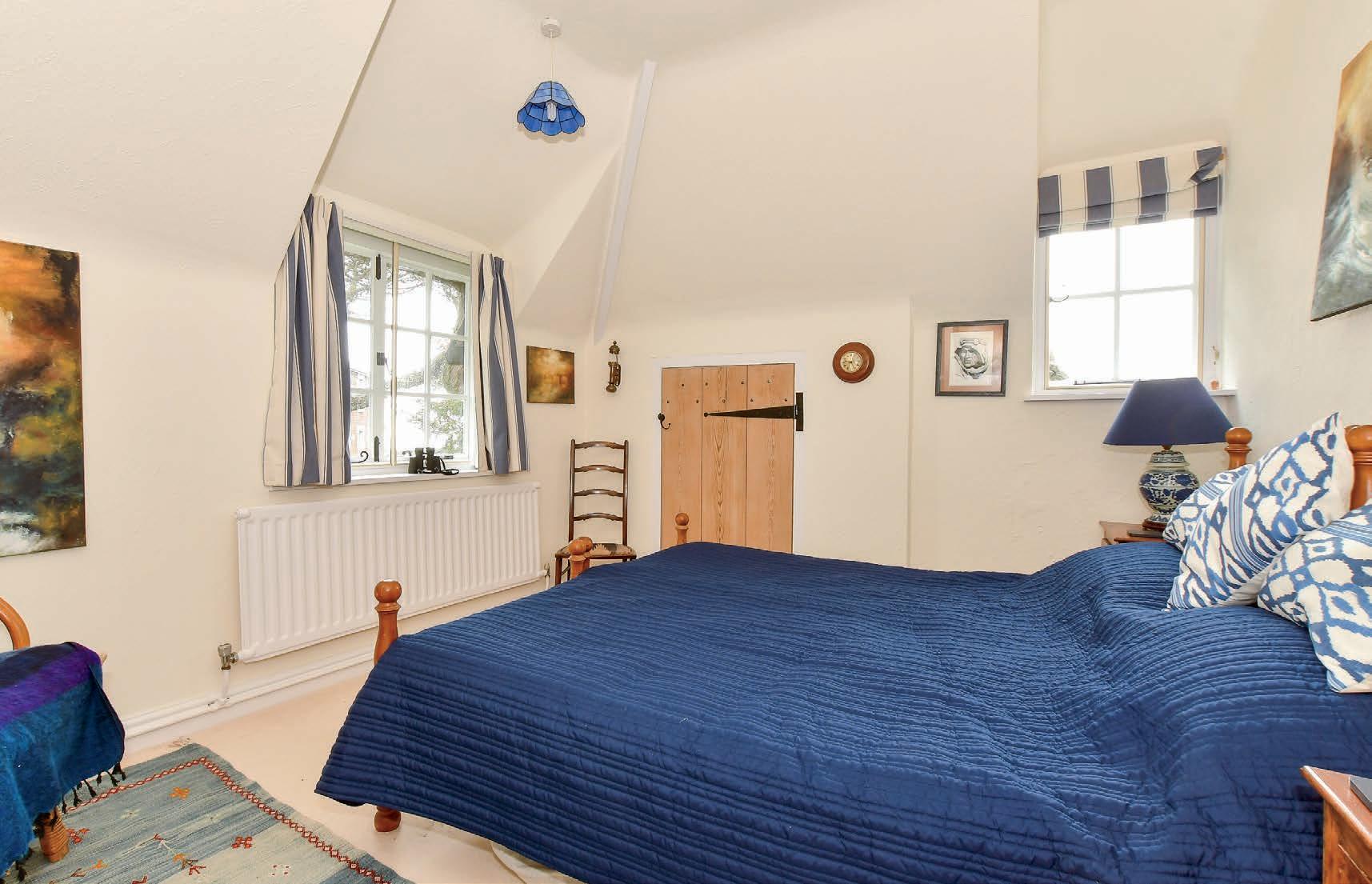 On the first floor are a further two double bedrooms plus a single. The spacious principal bedroom benefits from a large set of built-in wardrobes and boasts far-reaching views to the sea. The second double shares the same advantages as the principal and the final bedroom has a sweet little feature fireplace, quite unique to Baillie-Scott’s style. On this floor is also a contemporary family bathroom, tastefully designed and with a widened bathtub to accommodate the shower.