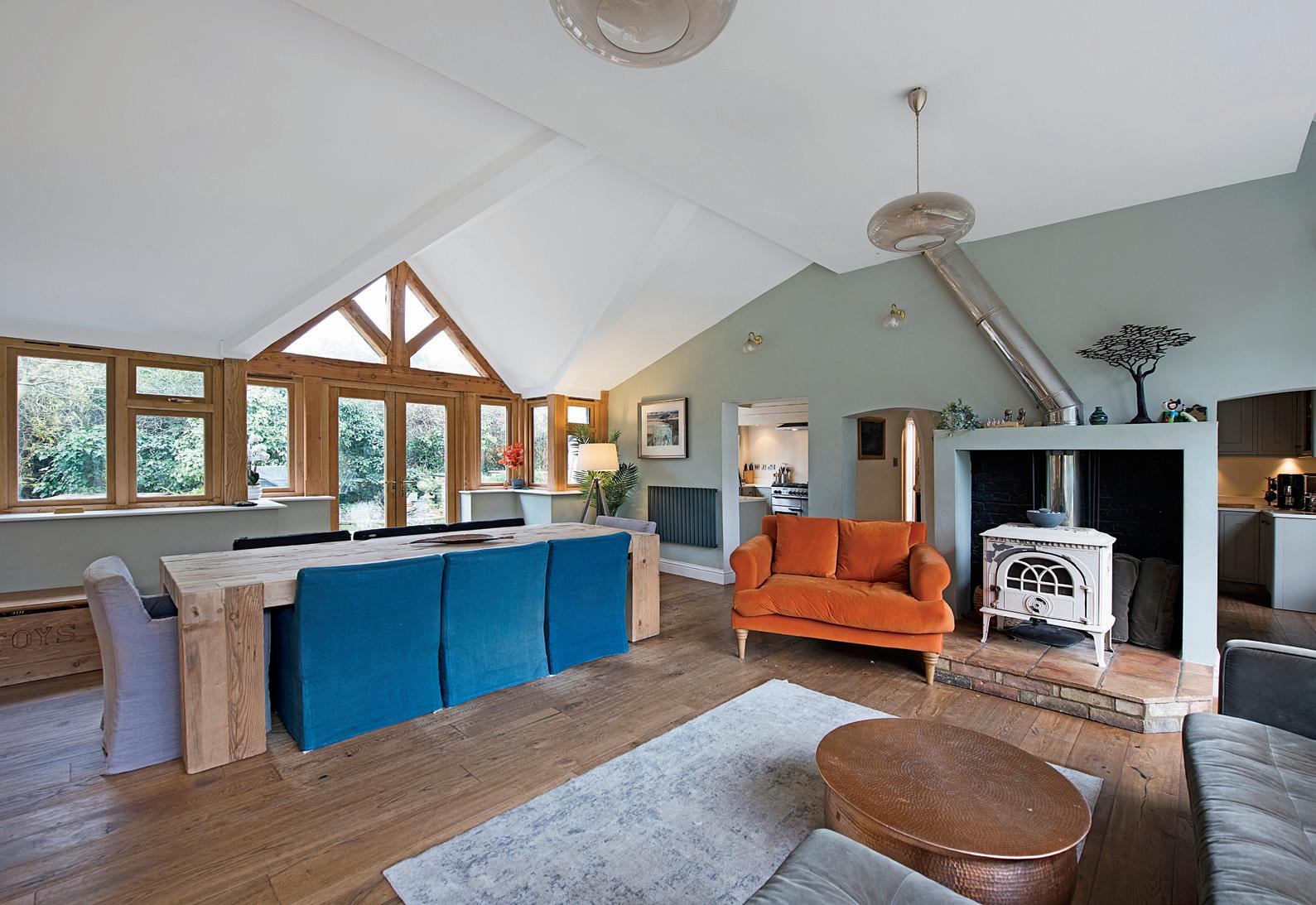 Stepping inside, a spacious entrance lobby/boot room provides generous storage, ideal for a busy household. At the heart of the home is the generous semi open-plan kitchen, living, and dining area, beautifully finished with a refitted kitchen, vaulted ceilings, and a wood-burning stove. This inviting space is designed for both family life and entertaining, with large windows that flood the room with natural light and offer stunning garden views.