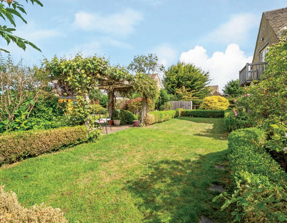 The rear garden is a tranquil haven—easy to maintain and thoughtfully designed for both entertaining and everyday enjoyment. It features a pergola, herbaceous borders and a newly installed double garden shed with power. Electrics are already in place for future additions such as a hot tub, sauna, and/or garden studio. To the front, a lavender garden sits behind a traditional Cotswold stone wall, creating a charming approach.