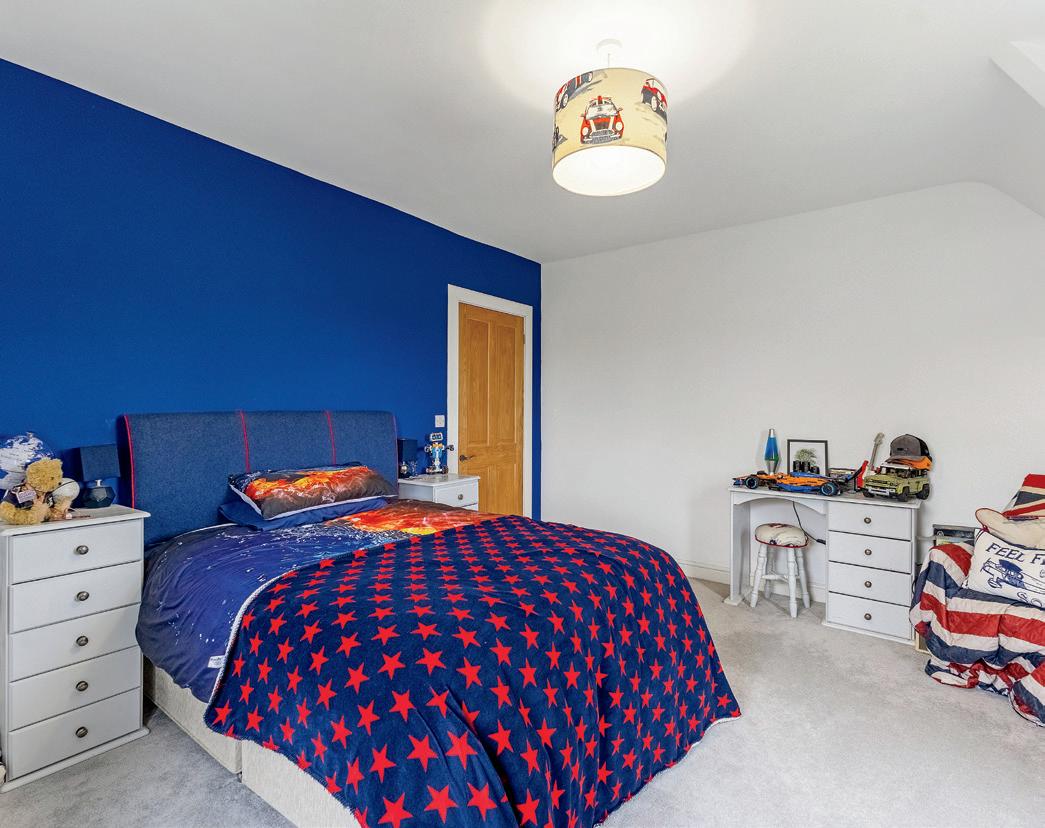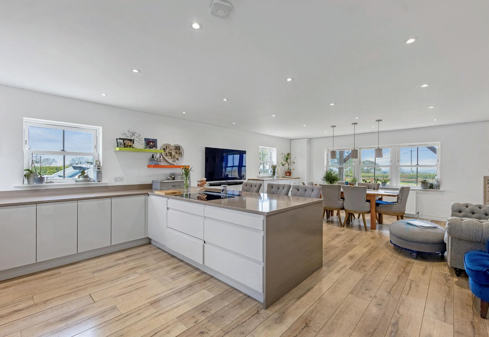 A welcoming entrance leads into a beautifully modernised family home combining characterful features with contemporary living. At its heart is an expansive openplan kitchen/dining/family area, complete with breakfast bar and seating and ample cabinetry. The main living room is centered around a charming fireplace and framed by large windows and French doors that bathe the space in natural light with one end currently being used as a music area. A well-appointed utility room and a practical boot room add to the daily convenience of countryside living, while a versatile ground-floor room — ideal as a study, office, or occasional guest bedroom — enhances the home’s flexibility.