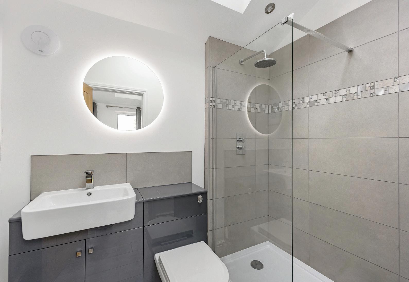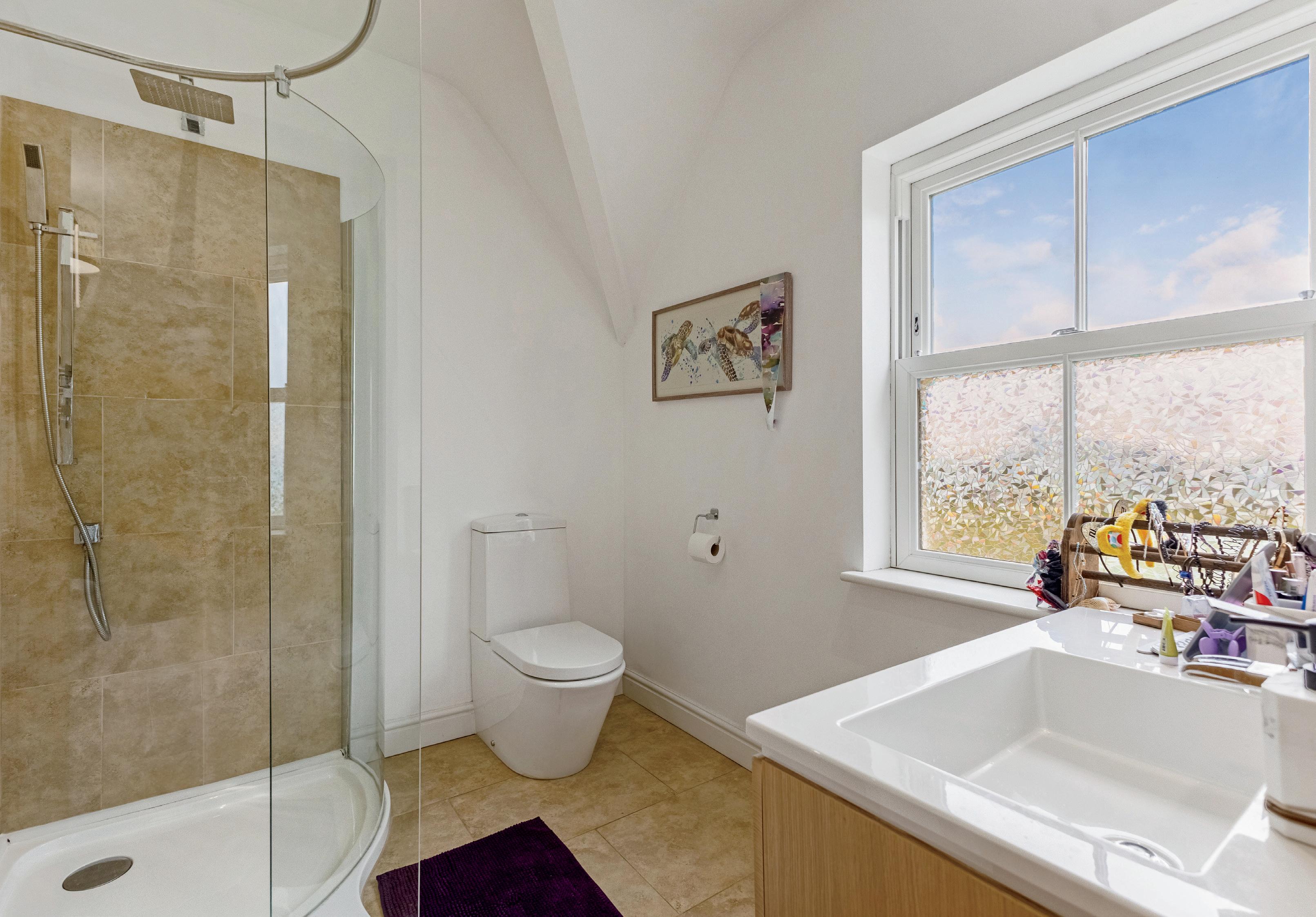 Upstairs, the principal bedroom is a true haven — triple-aspect windows, fitted wardrobes, private balcony with outstanding views, and a sleek ensuite. Two further bedrooms are generously sized, one benefitting from its own nicely presented en-suite. A fourth bedroom and main family bathroom completes the layout, making this an ideal home for families or those seeking multi-generational living.