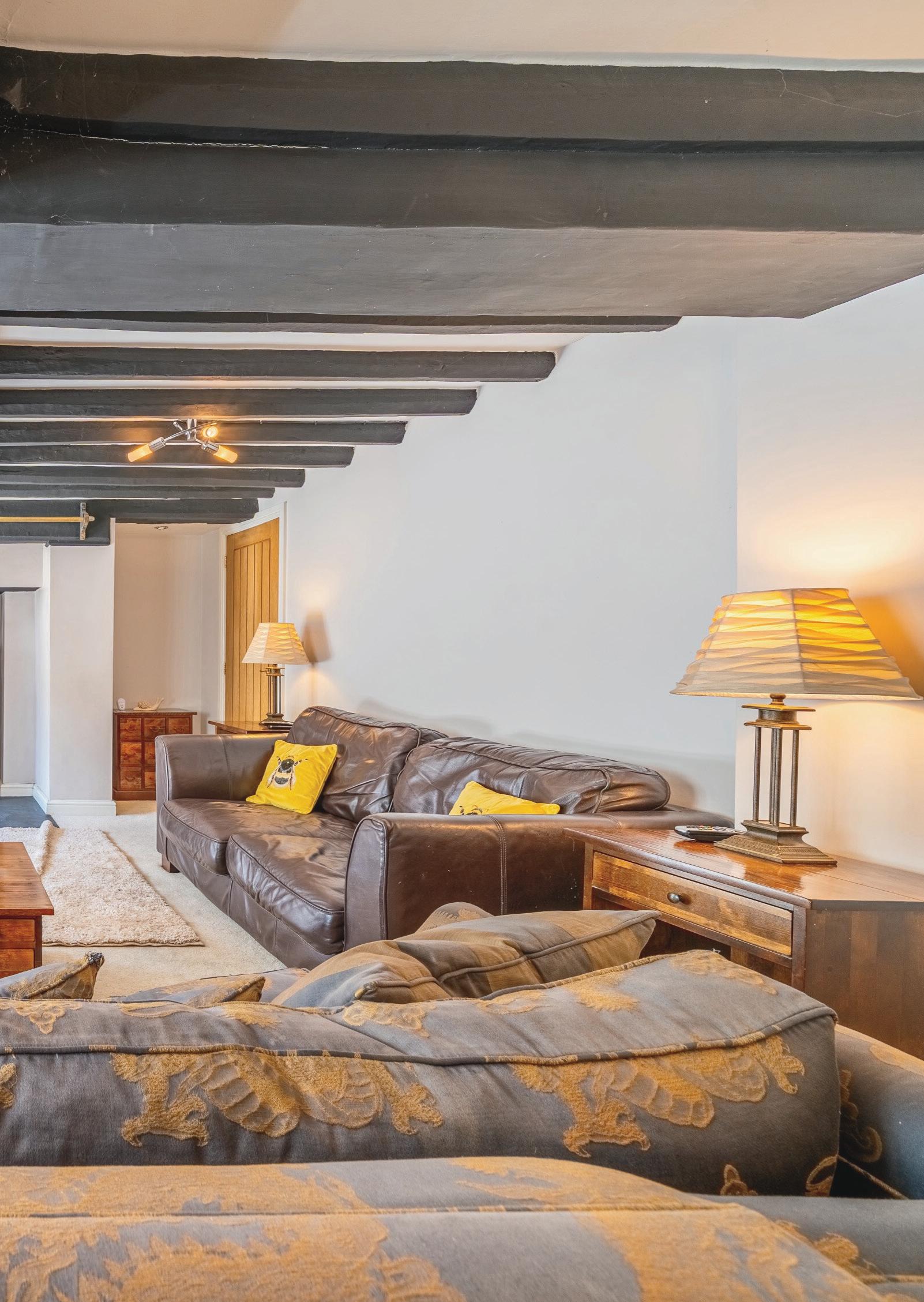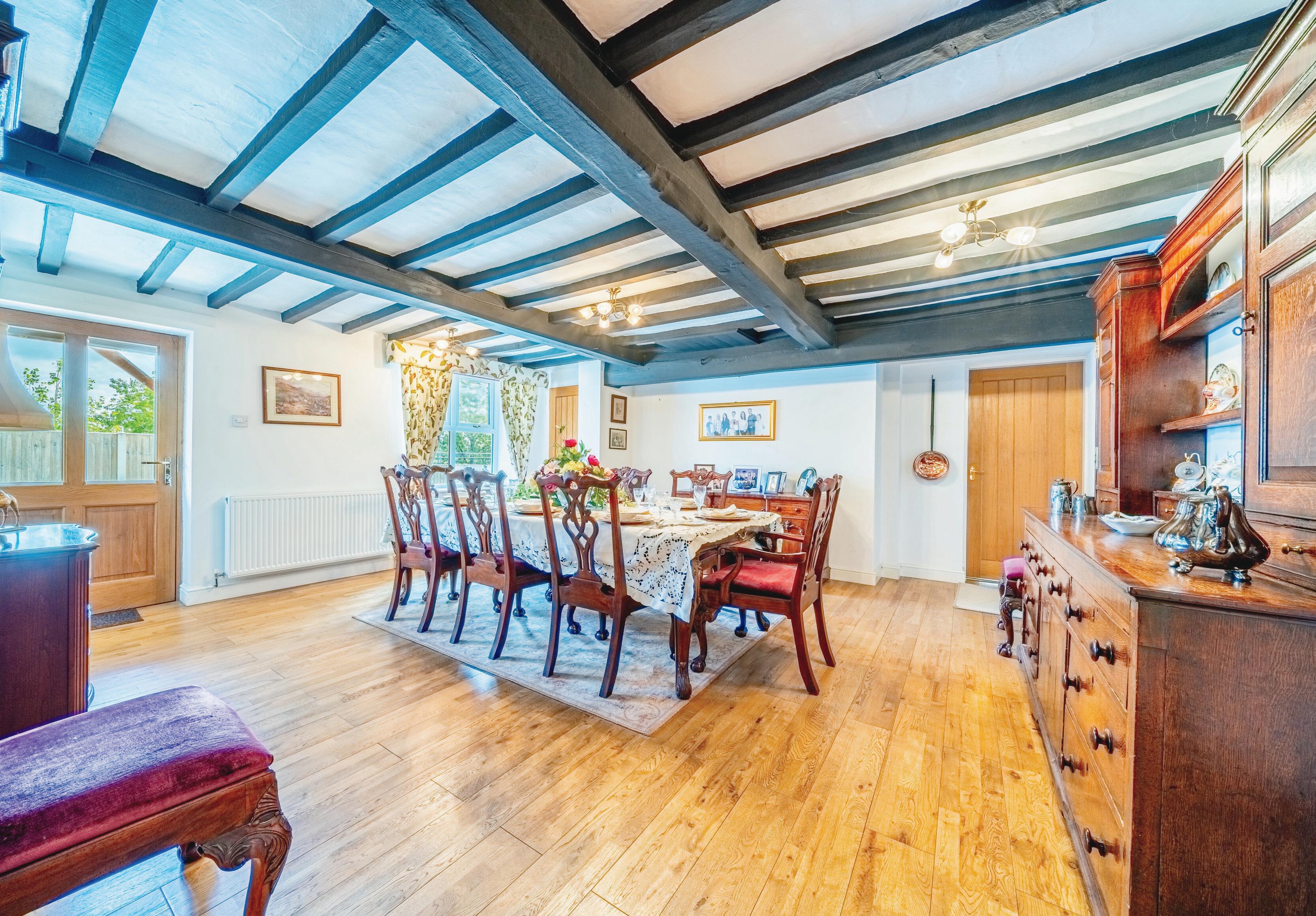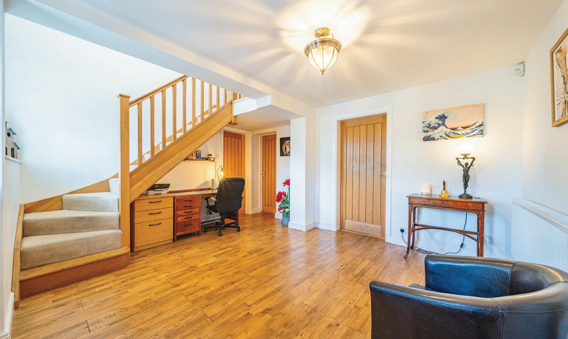 The home opens into a grand entrance hallway, inviting guests into a spacious yet welcoming ground floor where traditional beams meet sleek lines and natural light pours through updated, windows.