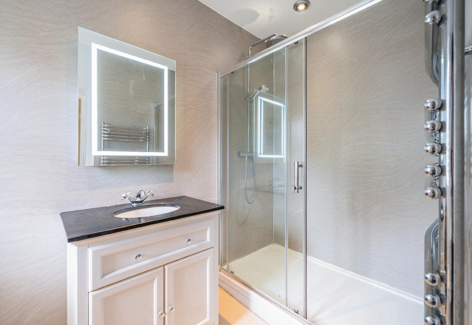 5 further bedrooms with four being spacious doubles are found on this floor, each enjoying generous proportions, countryside outlooks, and thoughtful finishing touches. One being furnished with an ensuite shower-room whilst two modern family bathrooms serve the other rooms. While bespoke oak joinery, soft textures and neutral tones provide a consistent atmosphere of understated elegance.
