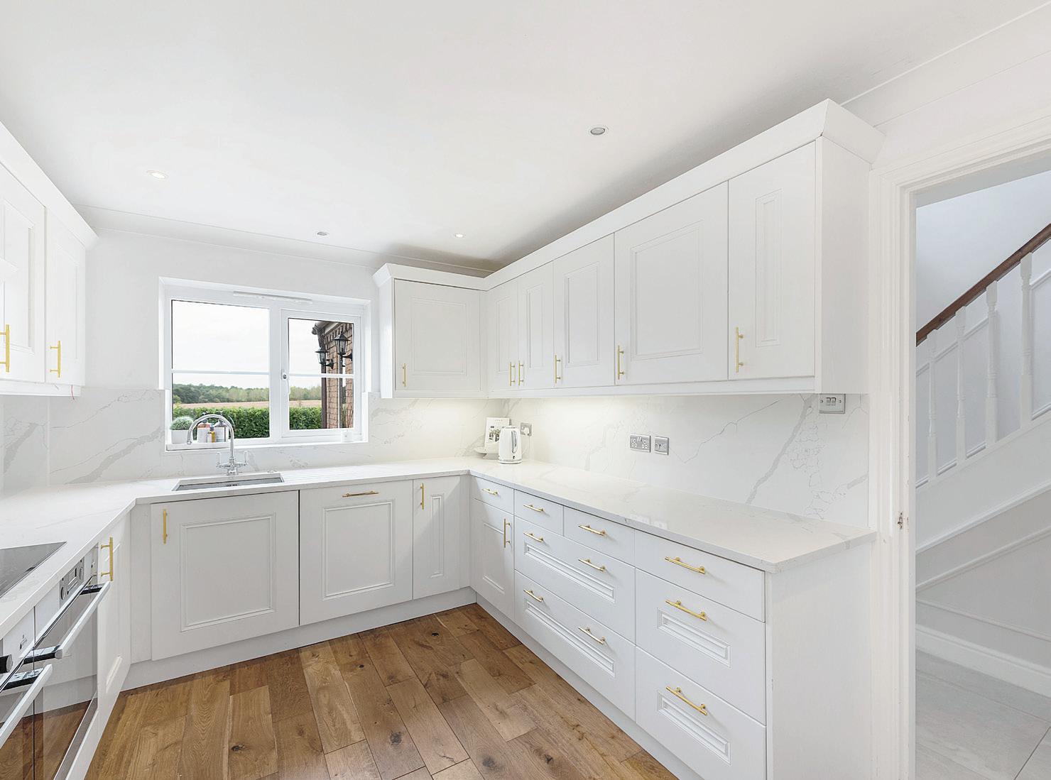 The well-appointed kitchen, with stone worksurfaces, is complemented by a utility room and a generous laundry room, the latter offering scope to be reimagined as a snug or peaceful home office. The layout has been carefully designed for both entertaining and the rhythms of daily family life.