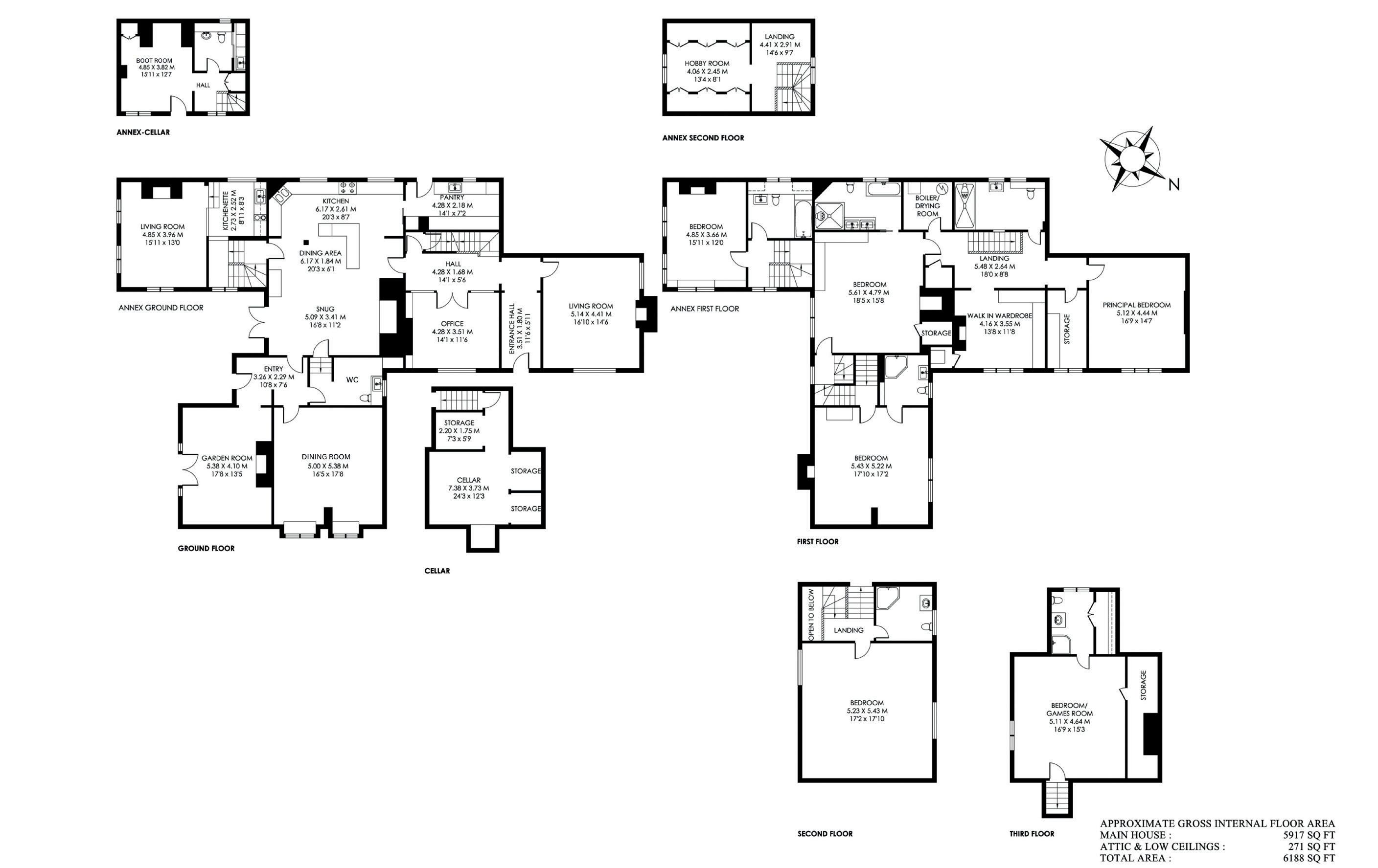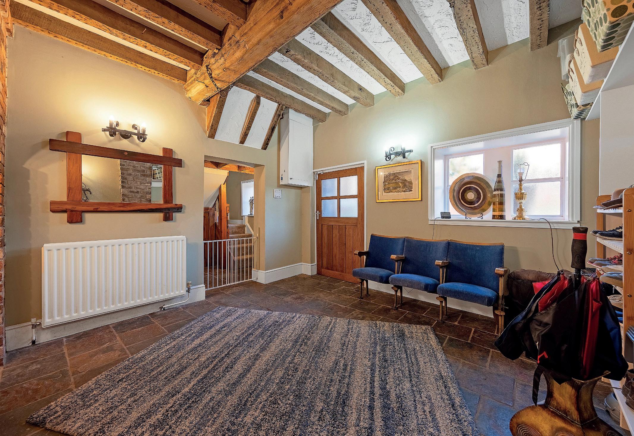 The main access to the house is from the side elevation, the light, open hallway gives access to the main sitting room with its large windows and high ceilings, another large reception room currently used as a home office, there is also access to the cellar and the magnificent open plan kitchen with large centre island, integral appliances, beautiful inglenook fireplace, large pantry and access to the 1st floor, annexe and inner lobby. The inner lobby gives access to the rear courtyard, the formal dining room with original cheese presses in situ, large WC and the simply stunning garden room with its inglenook fireplace and incredible vaulted ceilings. There is also a staircase to the first floor.
