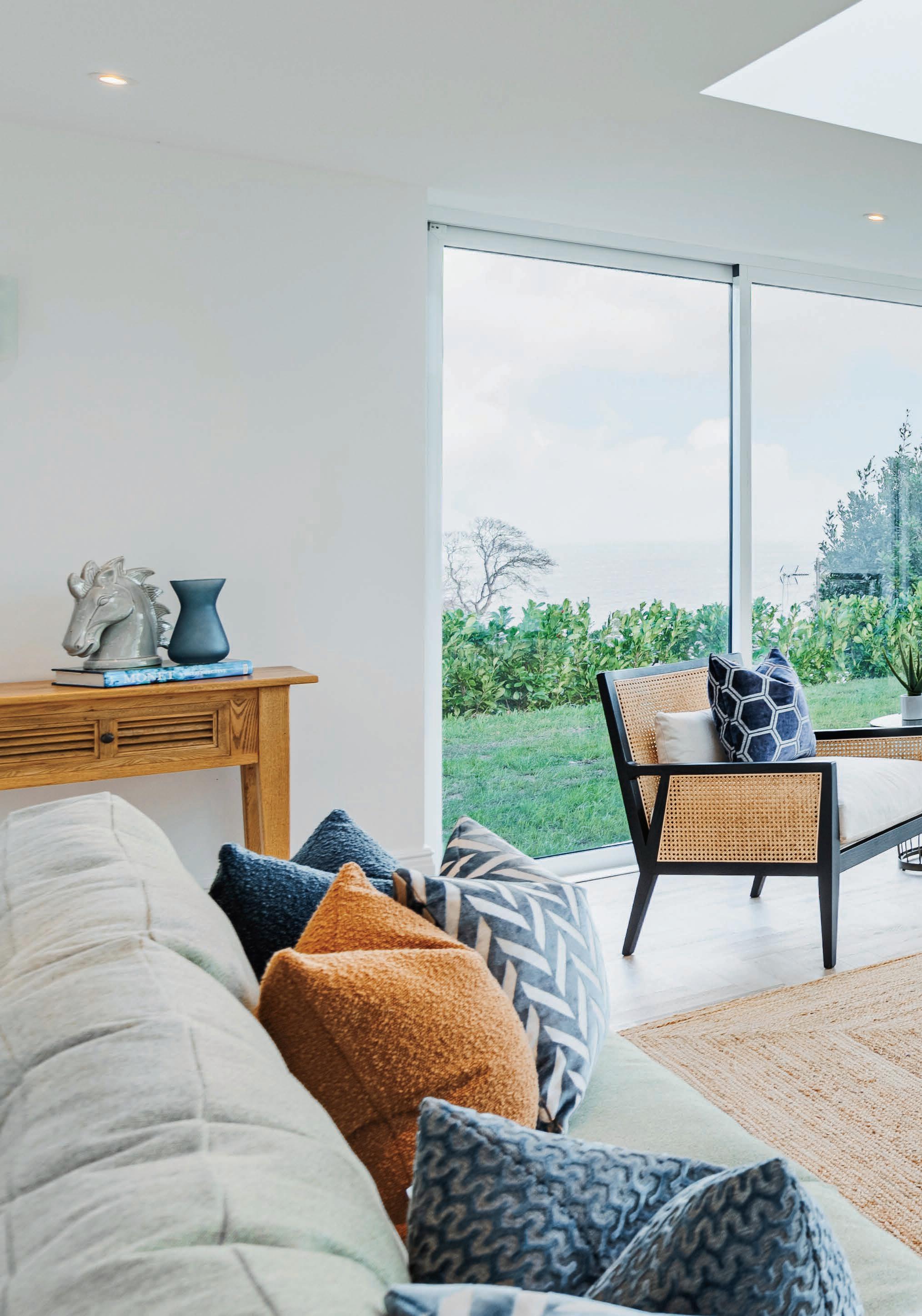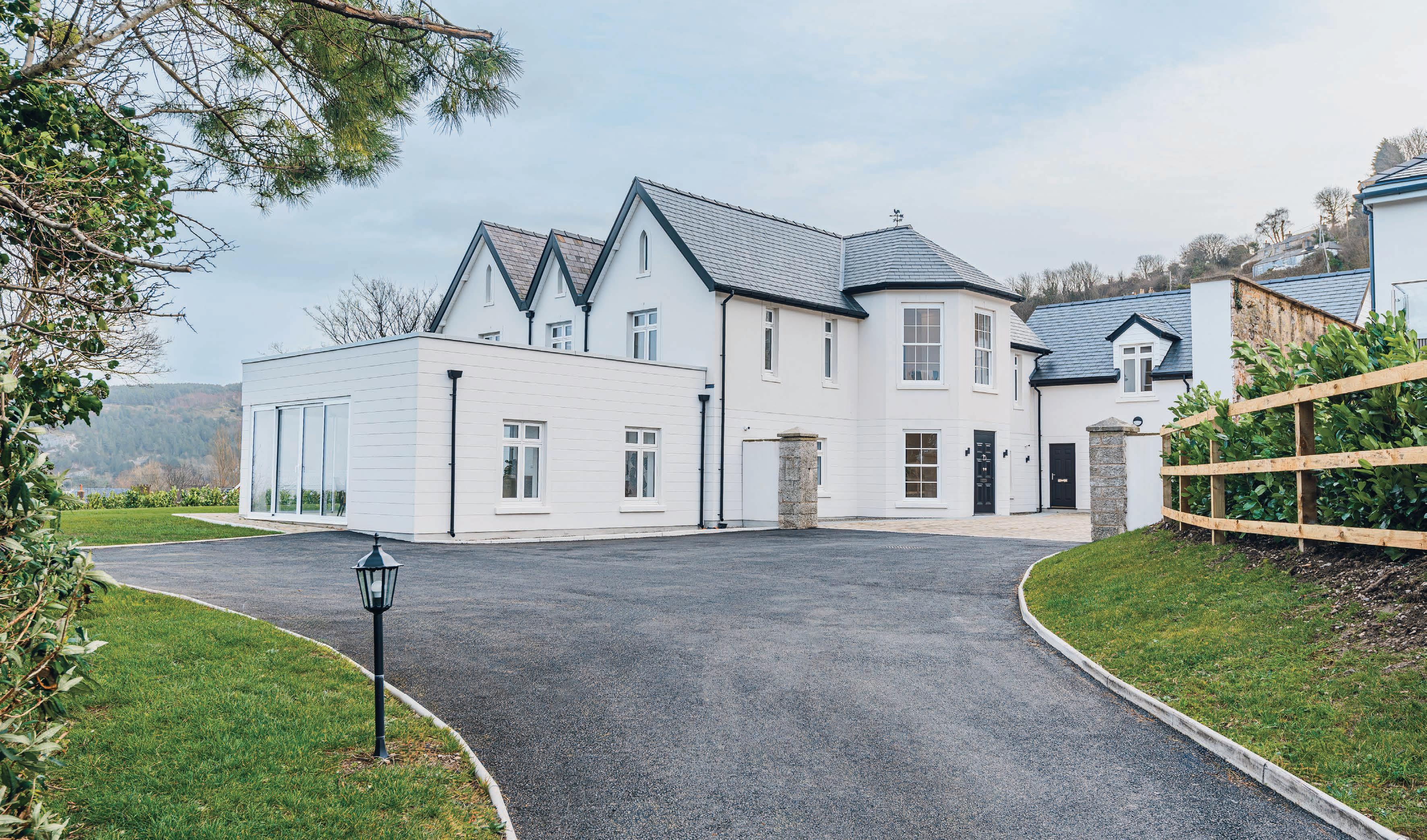 A gated, Private, sweeping driveway leads to the main parking area and double garage with internal access to the property. The enclosed paved courtyard, accessed directly from the drive, offers a serene outdoor space. The property is surrounded by wrap-around gardens laid to grass, with shrubs and hedging enhancing the coastal views.