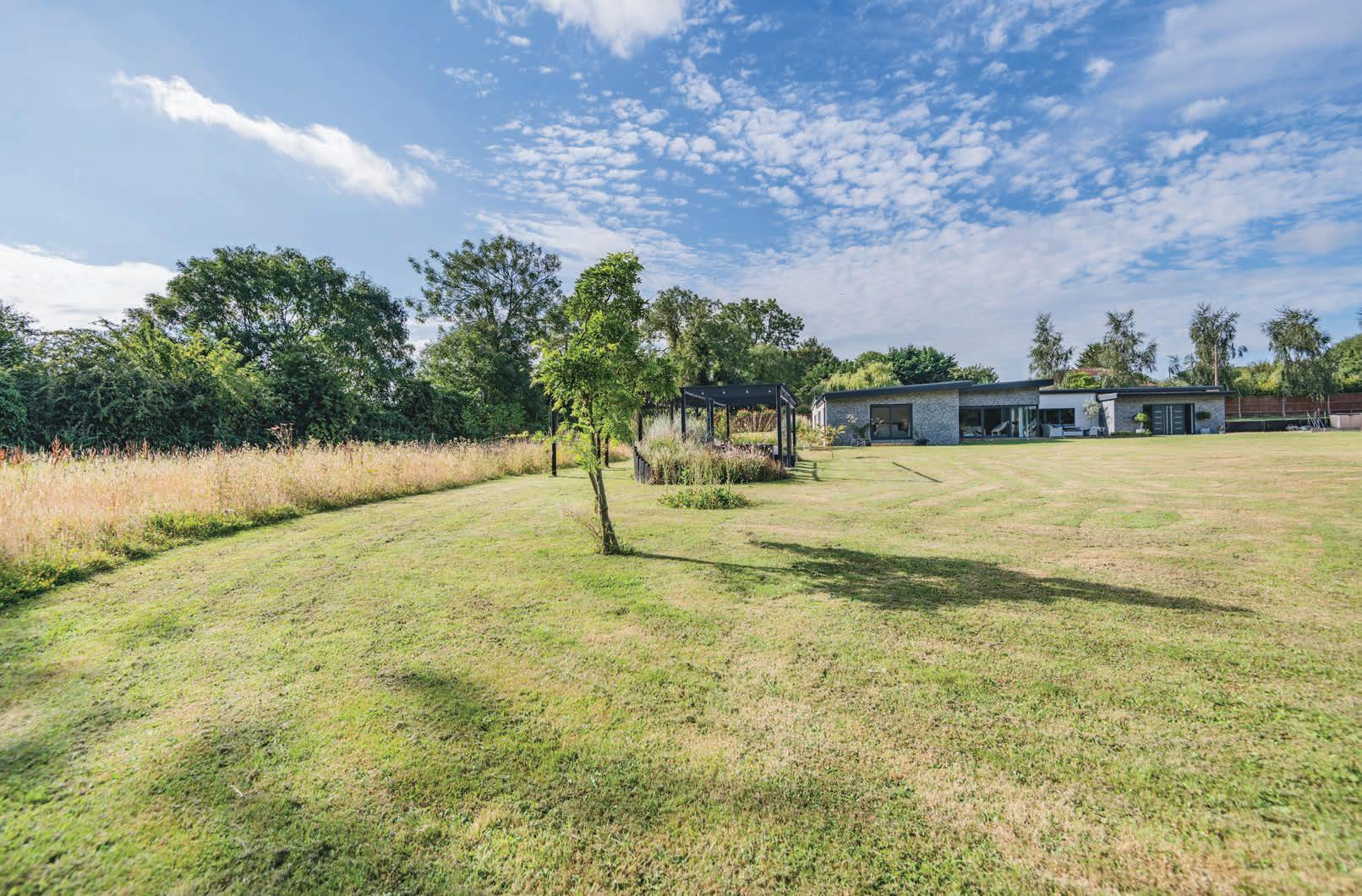 As you pass through the gates of The Paddock, a long, winding driveway leads you to this secluded property, nestled out of sight amidst its expansive grounds. Upon arrival, you are greeted by a tree lined lawned plot, including a wildflower meadow that enhances the natural beauty of the property’s surroundings. The thoughtfully designed garden features vegetable patches, a pergola adorned with festoon lighting, and a tranquil water feature, creating an idyllic outdoor haven perfect for al fresco dining and relaxation. For added family fun and entertainment, there is ample space within the garden to consider the addition of a swimming pool, tennis court or other outdoor recreations further enhancing the outdoor lifestyle this property offers. The generous plot ensures that the garden enjoys allday sun, offering stunning views of both sunrise and sunset.