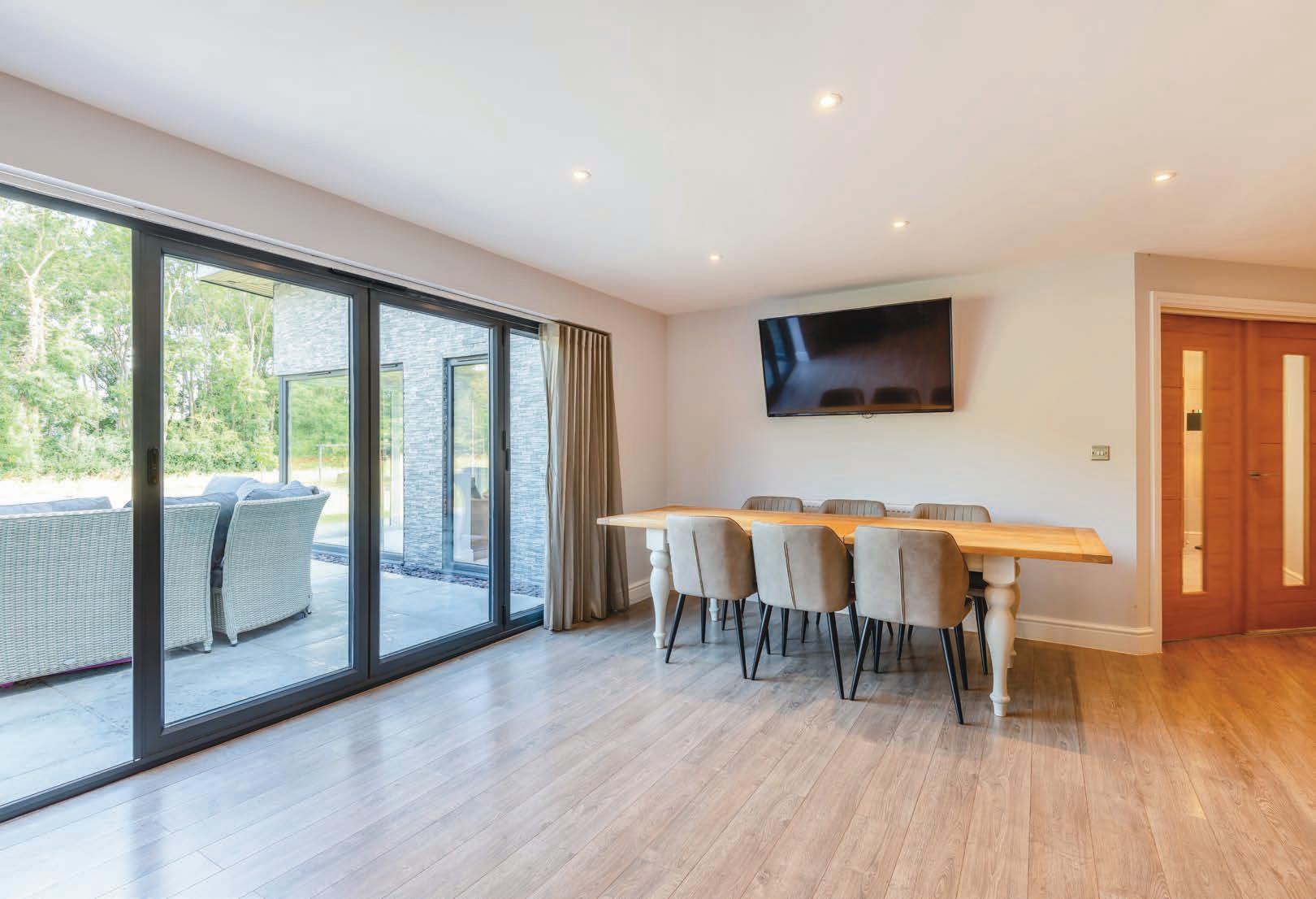 The home itself is a testament to modern design, with extensive use of glass that floods the interior with natural light and offers uninterrupted views of the lush surroundings. Full-height windows, bifold doors, and corner windows throughout the property create a seamless flow between indoor and outdoor spaces. The master bedroom, sitting room and dining area open directly onto the patio, further enhancing the connection with nature.