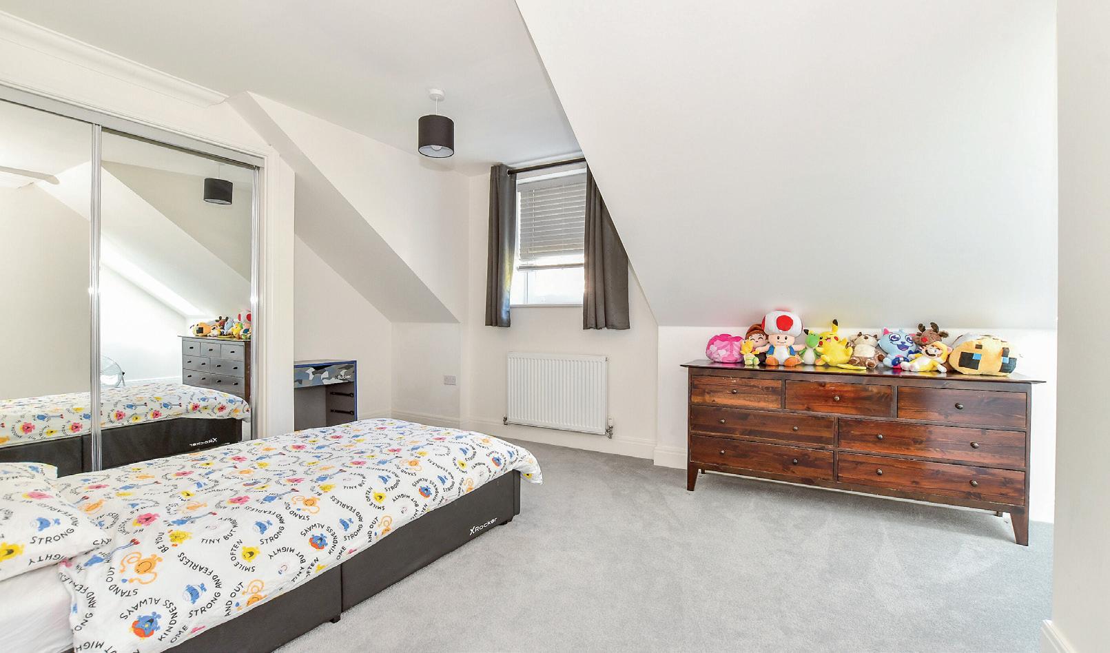 The first-floor landing offers a generous airing cupboard and leads to two double bedrooms, including a guest room with fitted mirrored wardrobe, a charming bay window, and an en suite shower room. The principal bedroom features a dedicated dressing area with extensive fitted wardrobe and a luxurious en suite complete with a walk-in shower and vanity basin. On the top floor, an impressive family bathroom provides a bath, separate shower, and vanity basin, alongside two further double bedrooms with partially vaulted ceilings and built-in mirrored wardrobes, an ideal retreat for any family member to enjoy their own space.