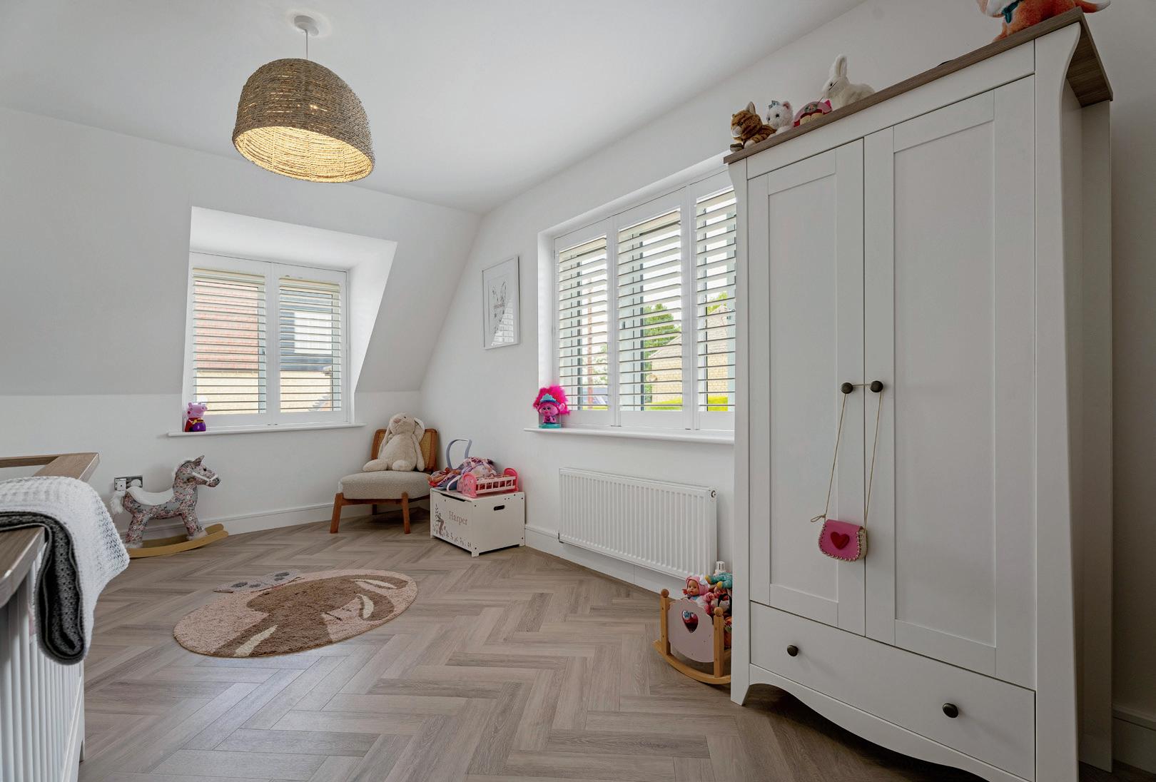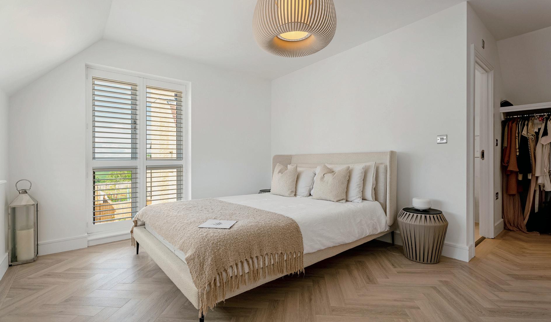 Leading to the first floor galleried landing, the elegantly appointed bedrooms are bathed in natural light, filtering through the classic white plantation shutters, which enhance the serene, airy ambiance. The neutral palette, with soft off-white walls, provides a calming backdrop that highlights the room’s sophisticated simplicity. The principal bedroom is en-suite with two further bedrooms and a family bathroom.