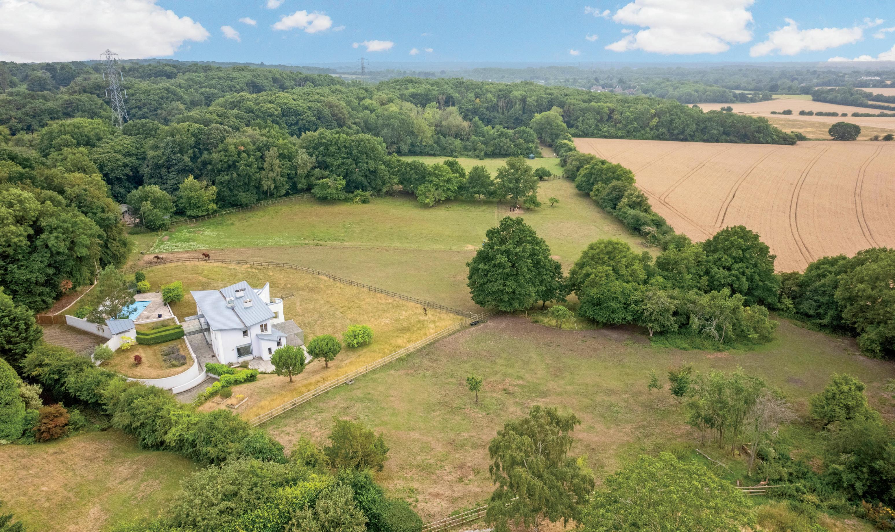 Situated in Well Hill, the property is approached by a glass and steel bridge into the main entrance. Accommodation in the main house comprises six bedrooms, four bathrooms and a cloakroom, kitchen with family room, utility room, double-height dining hall with balcony, triple-aspect reception room, study and laundry/plant room. The lower ground floor rooms are currently configured as a gymnasium but could be used for a home cinema.