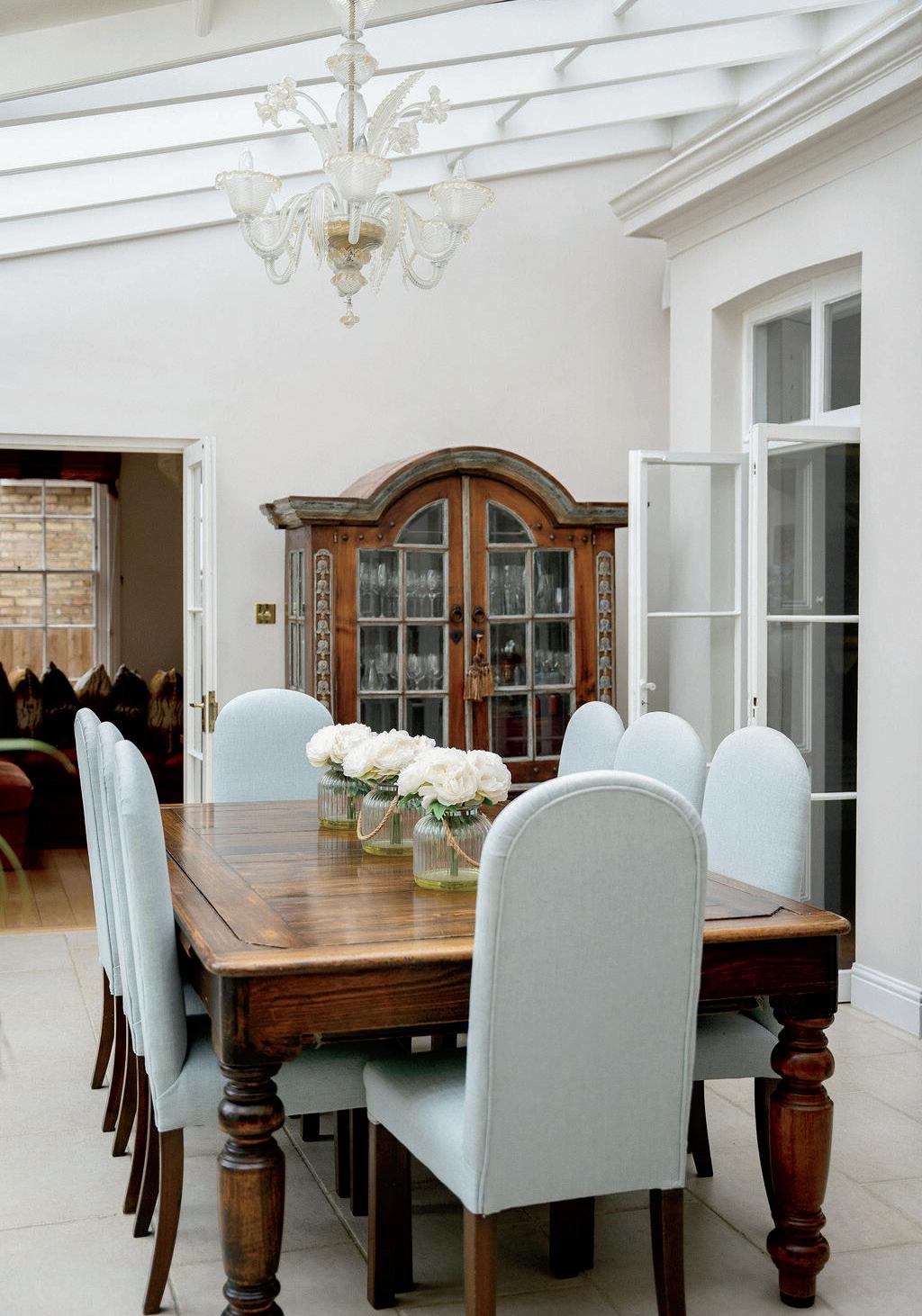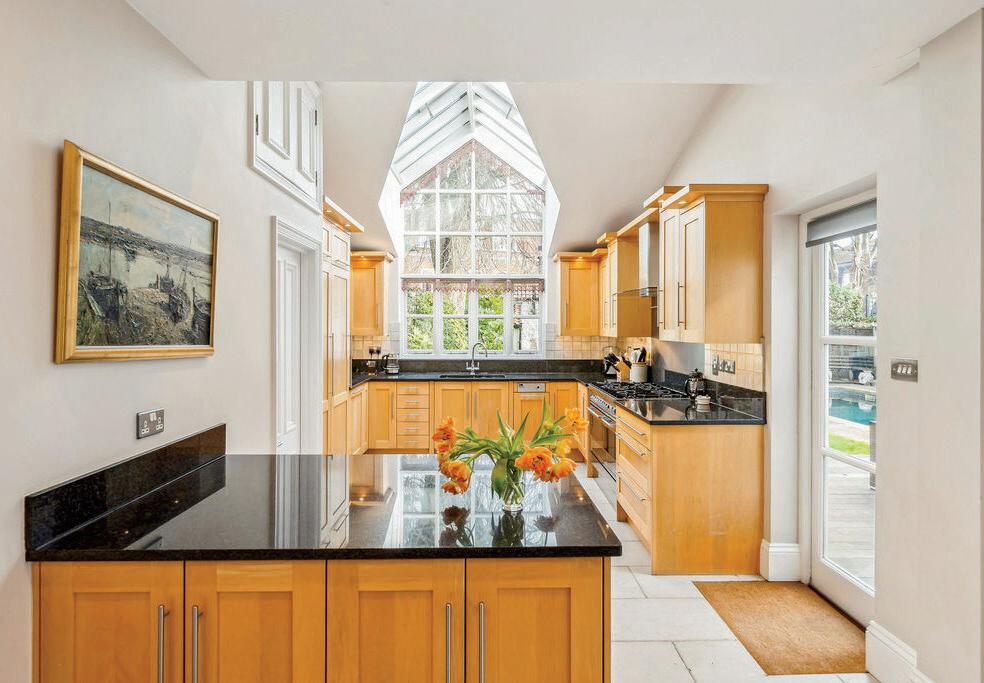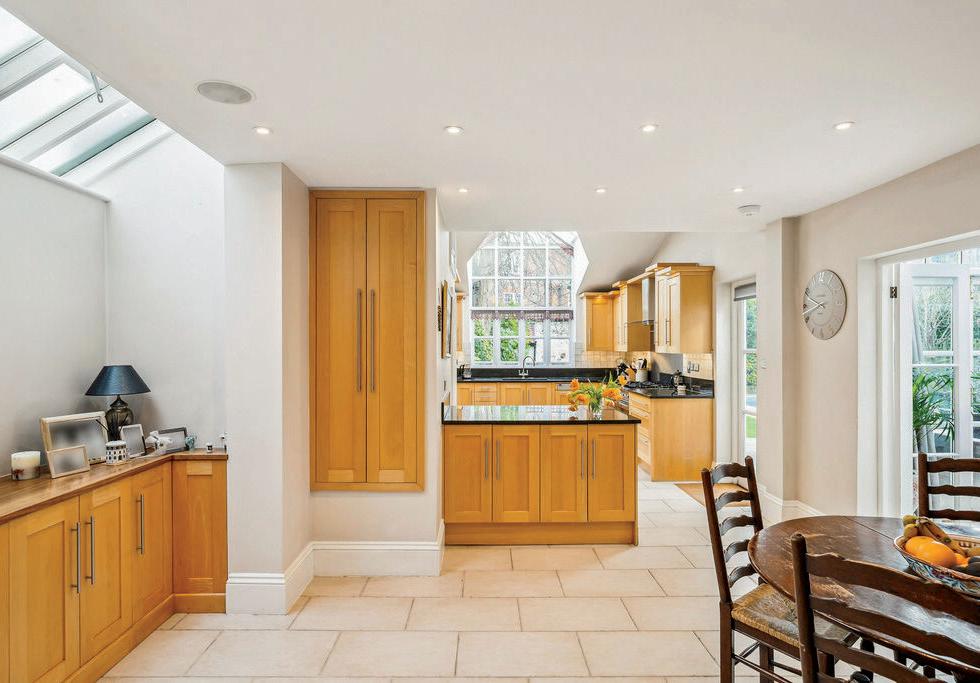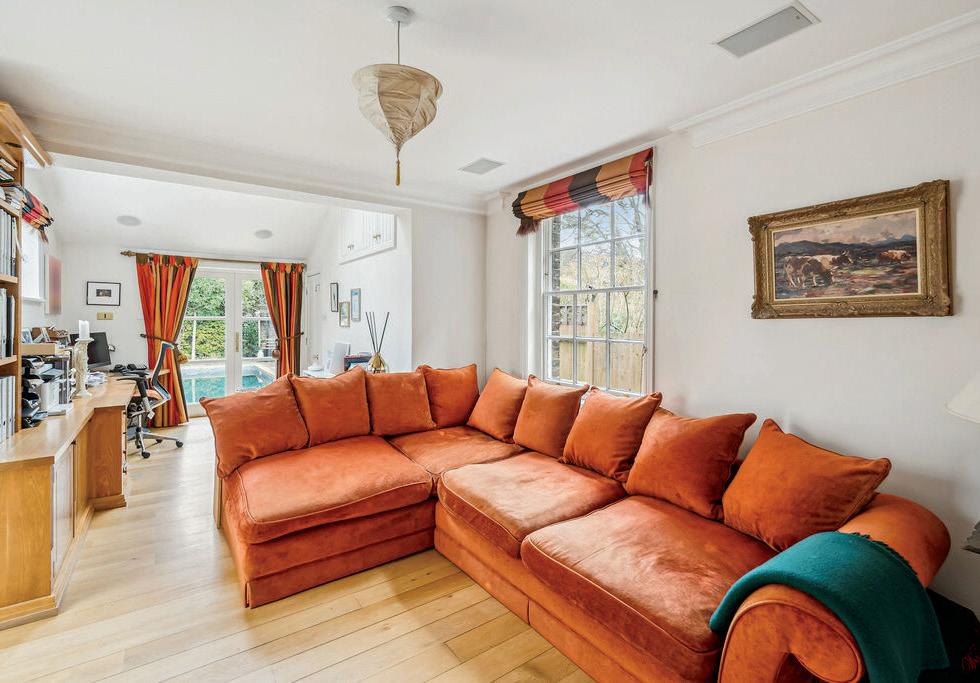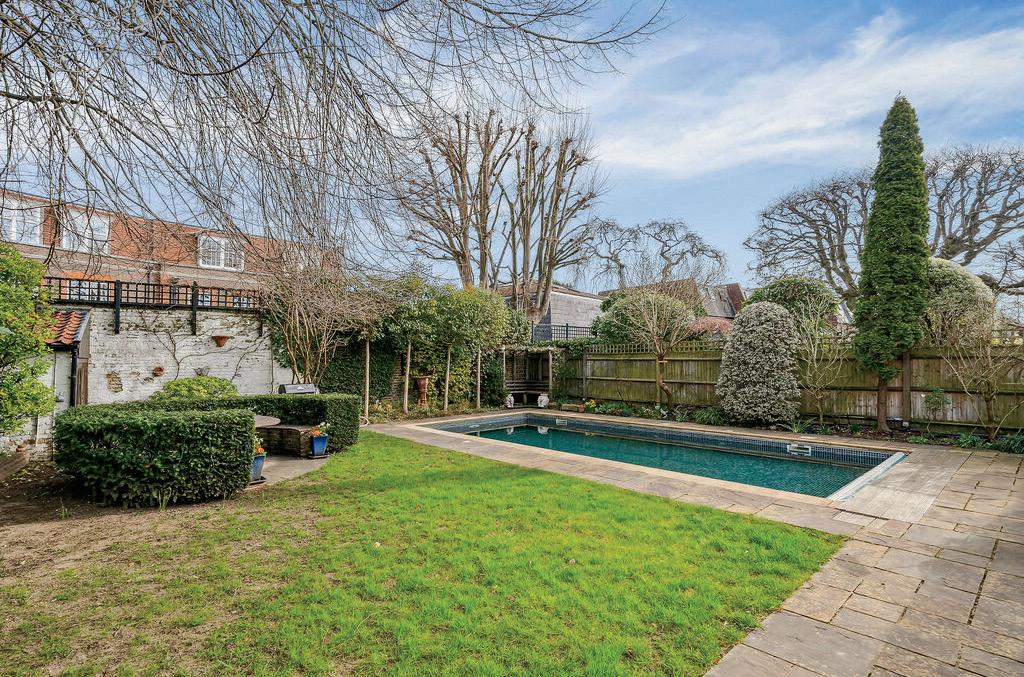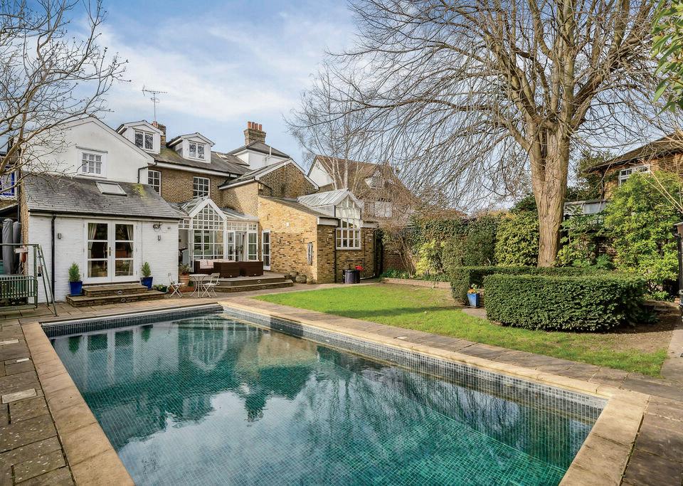 At the heart of the home lies an elegant conservatory dining room, accessed through two sets of original French doors that fill the space with light. This airy oasis invites you to linger over meals while enjoying soothing views of the well-established west-facing garden. Step out onto the decked terrace to find the jewel of the property: a superb outdoor swimming pool equipped with a heavy-duty safety cover and a highpowered “swim jet.” Surrounded by lush greenery, it feels like your own private retreat on sunny afternoons, while a charming brick outbuilding discreetly houses the pool’s machinery.