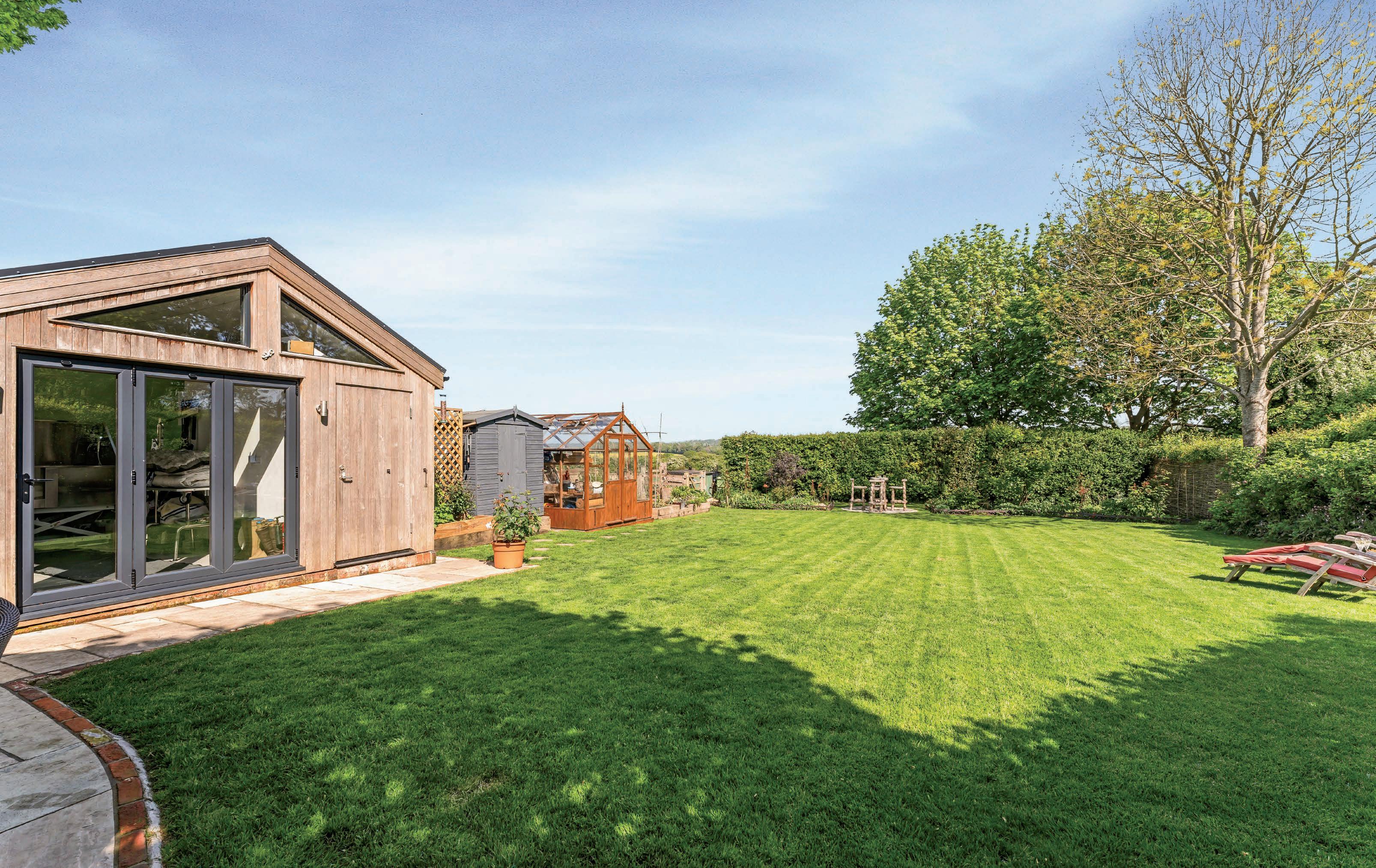 The garden is a private haven, backing onto open countryside with incredible far-reaching views, perfect for a morning coffee, evening drinks, or simply soaking up the peace and quiet. The patio area is ideal for outdoor dining and summer barbecues, and the garden also includes a storage shed, a timber greenhouse for gardening enthusiasts and an attractive studio outbuilding that works perfectly as a home office, art studio or gym.