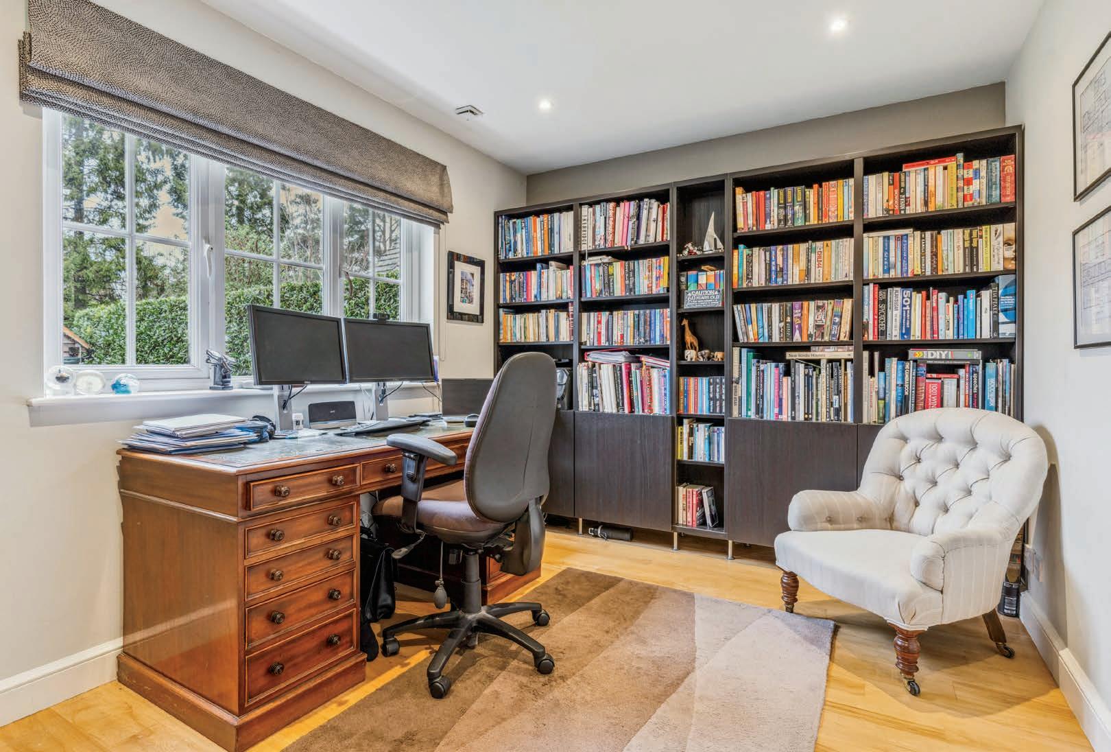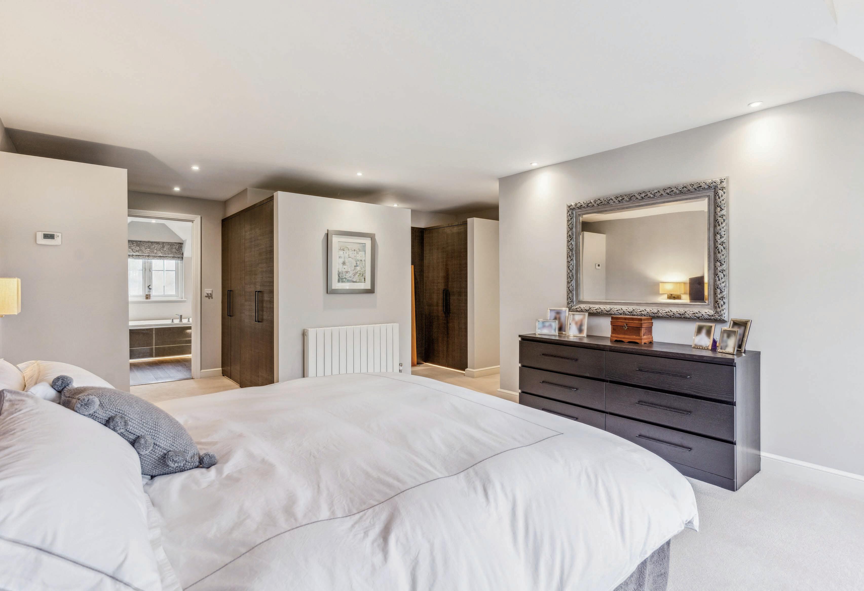 Ascending to the first floor there is a spacious landing with seating area. The principal bedroom boasts rear aspect views, a dressing room designed and built by Luke Jones Furniture, and a spacious en-suite with bath, separate double shower and double sinks. Accessible via the dressing room, stairs lead to a versatile loft room currently utilised as a pilates/ exercise space but could equally be used as a second office/ studio. Two additional double bedrooms enjoy en-suite facilities, alongside two further double bedrooms and a family bathroom.