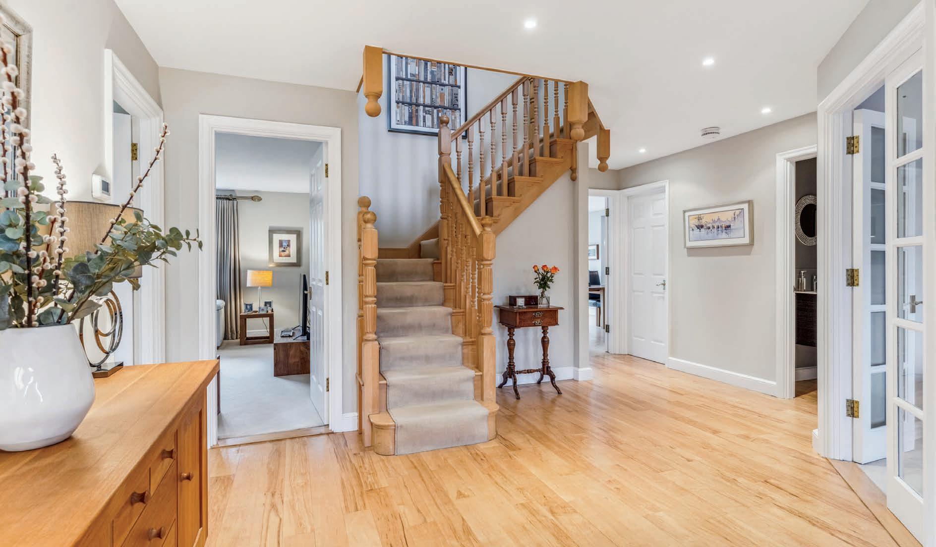 From the beautiful Oak frame porch, the spacious entrance hall provides direct access to the principal reception rooms. Overlooking the front garden, the study and dining room offer serene views of the surroundings. Positioned to capture the beauty of the grounds and the southerly orientation, the sitting room at the rear provides a bright and spacious sanctuary for relaxation. A standout feature is the expansive kitchen/dining/family room, serving as the heart of the home with built in speakers in the kitchen, dining and outside areas. The kitchen units are bespoke and hand made with a Seimens American Fridge/ Freezer, Miele wine fridge, AEG integrated fridge and freezer and Smeg cooker and integrated combination oven/ microwave. With three sets of doors leading out to the terrace, this space seamlessly integrates indoor and outdoor living, ideal for enjoying the warmer months. Adjacent to the kitchen is the cinema room, while completing the ground floor amenities are a utility room and cloakroom. It is worth noting solid maple wood floors throughout a large portion of the ground floor.