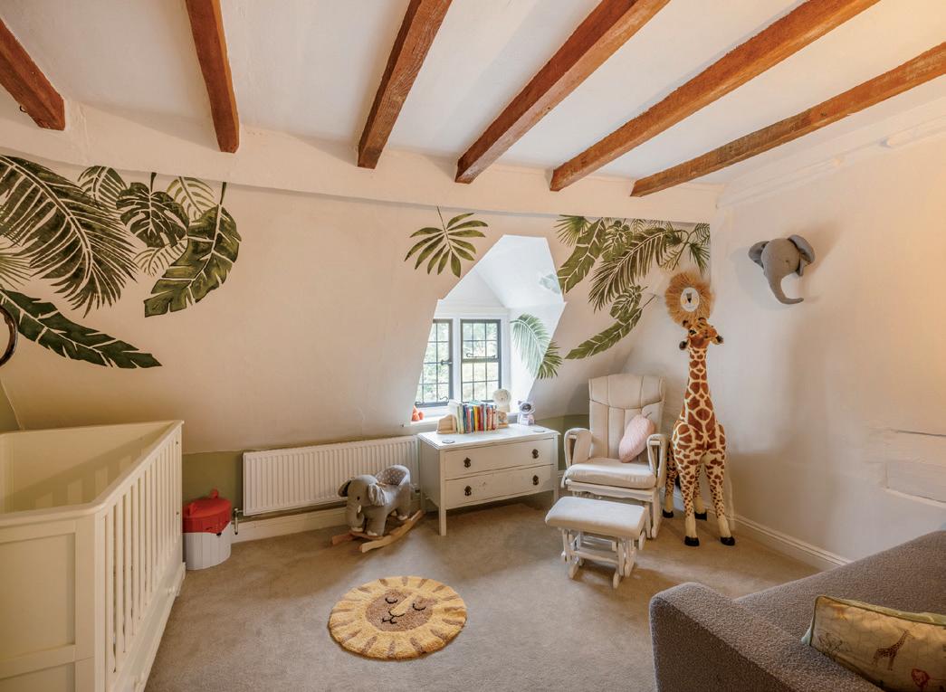 Upstairs, the main suite is a private haven, almost a separate wing, with its own oak-inlaid dressing room, luxurious emerald-and-gold en-suite, and peaceful garden views. Each bedroom has its own charm, from our son’s cosy nursery to bright, freshly decorated guest rooms with unique design touches. The family bathroom, inspired by a spa, invites long soaks under a skylight with views of the stars.