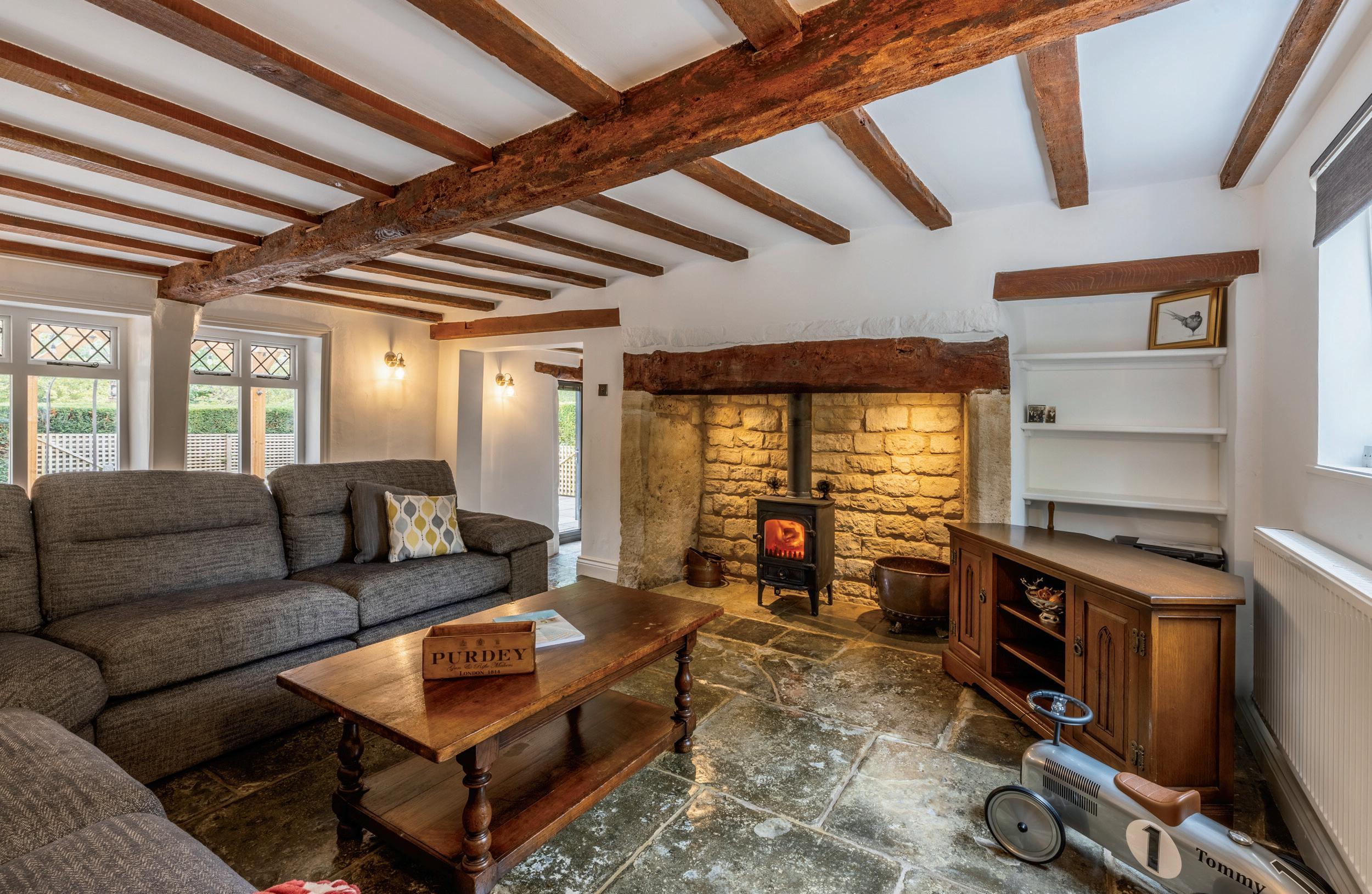 This inviting sitting room combines rustic charm and comfort, featuring exposed beams, a large stone fireplace with a wood-burning stove, and a characterful flagstone floor.