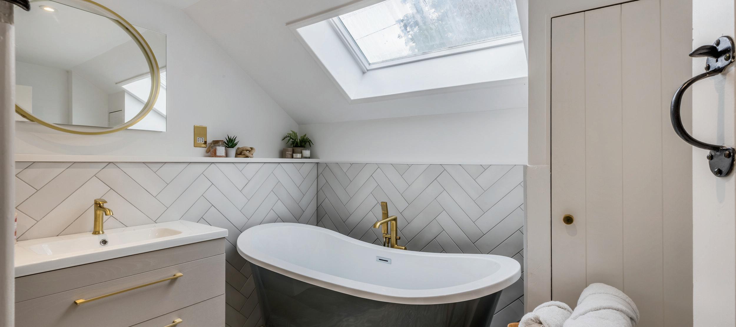 The beautifully appointed family bathroom features a striking freestanding roll-top bath and a spacious walk-in rainfall shower. Contemporary finishes are enhanced by chic tiling and elegant gold accents, creating a refined and modern space for relaxation.