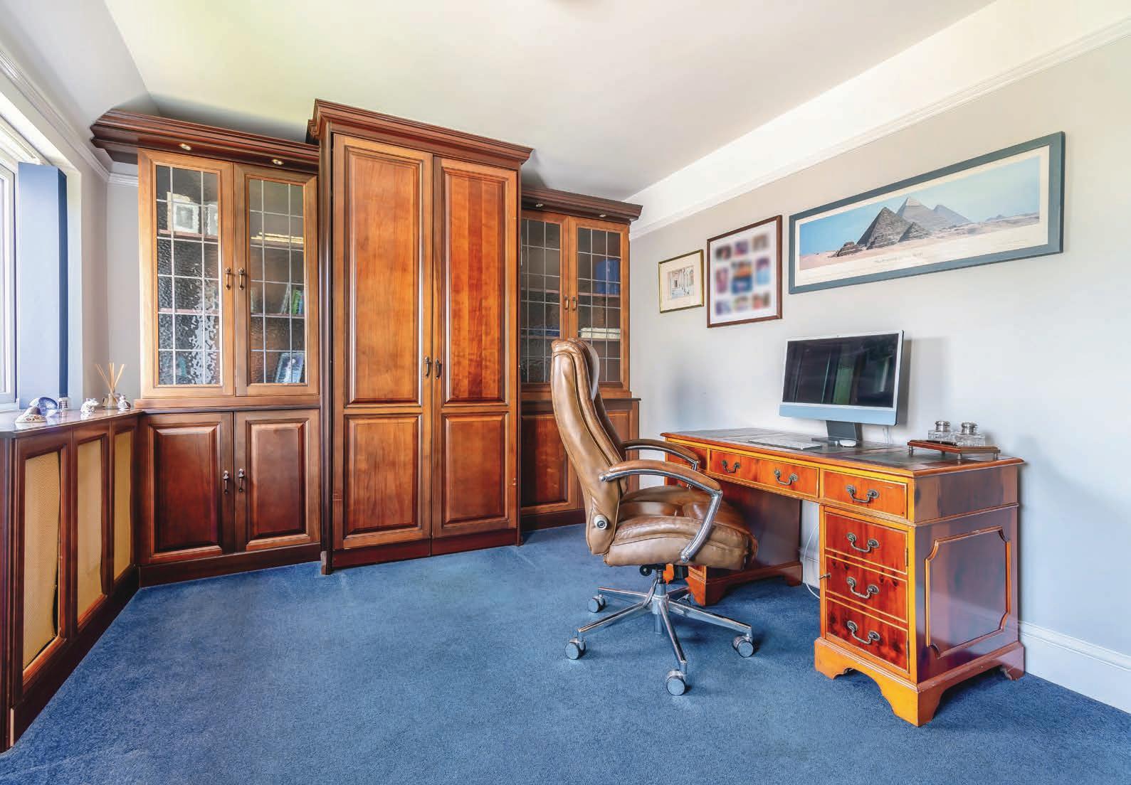 A home office offers versatile accommodation, is positioned to the front of the home, has two windows and fitted cupboards to one wall.
