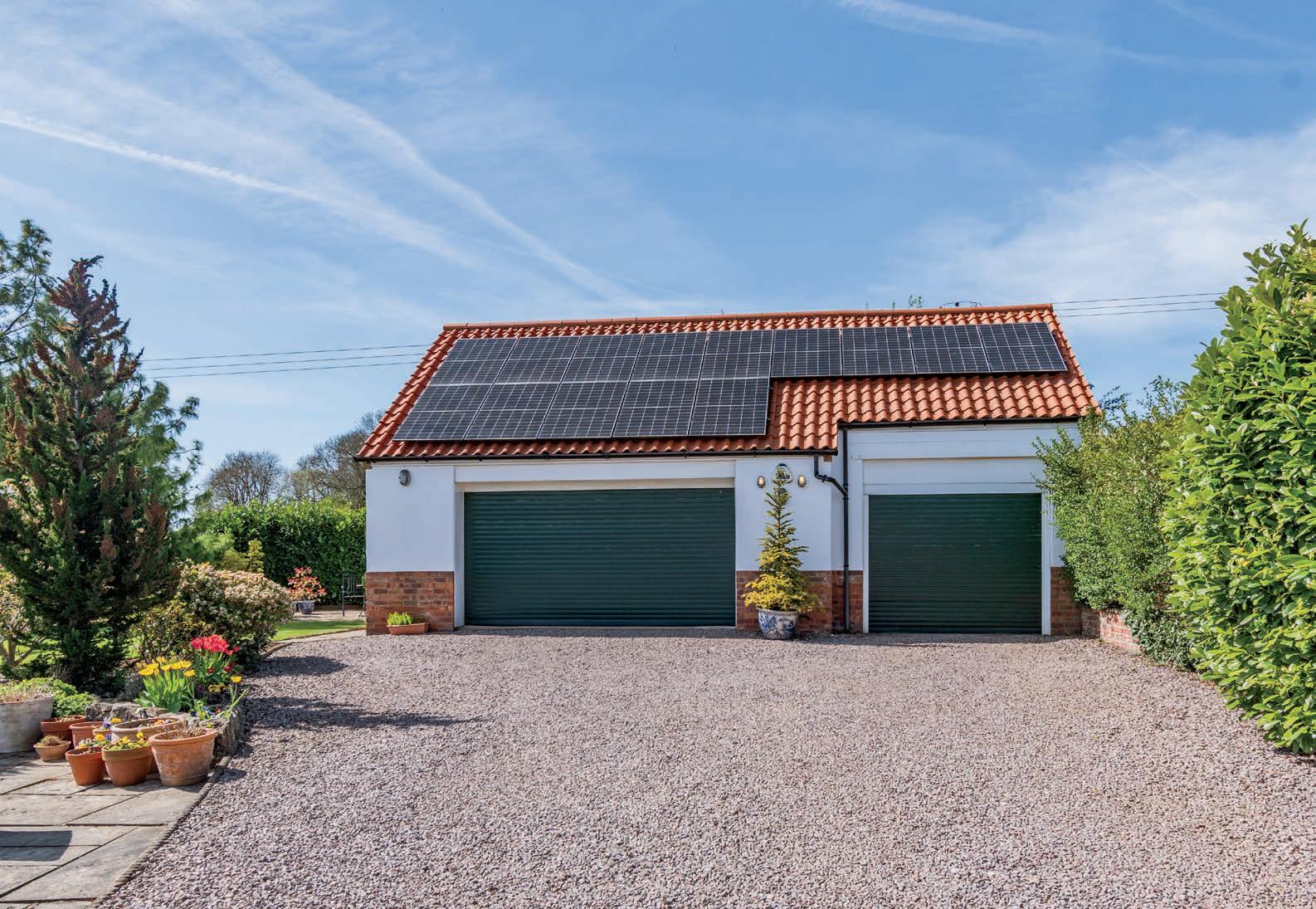 A brick-built garage with a double and single bay, two electronically operated entrance doors, power, lighting and a car charging point. First floor storage space and solar panels.