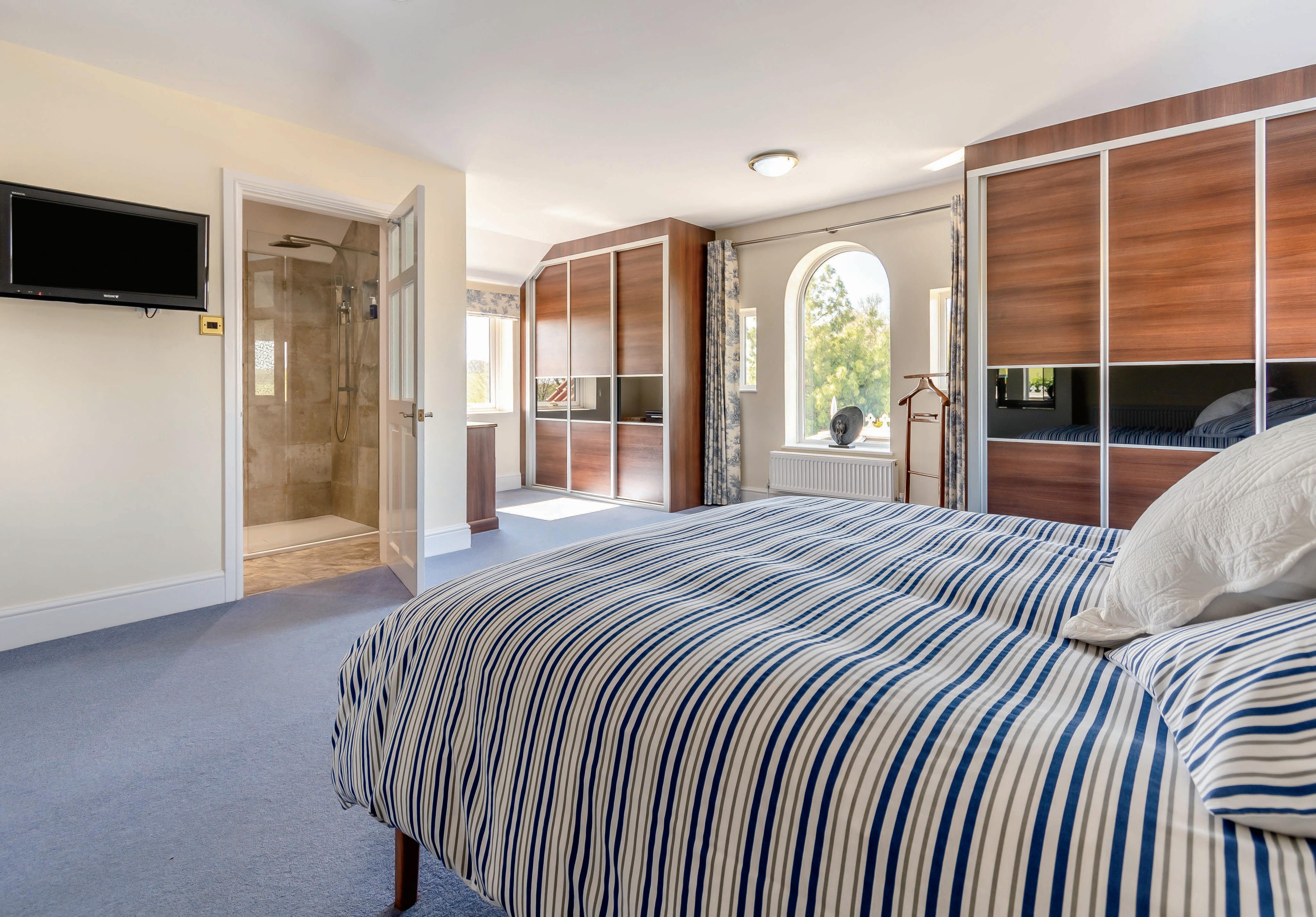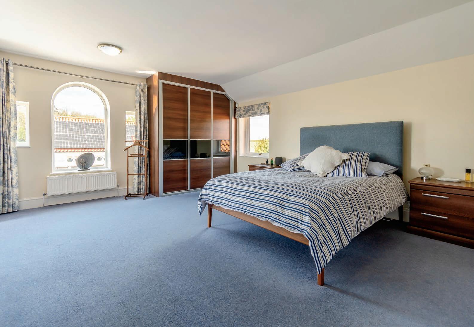 The principal bedroom suite is positioned to the rear of the home and is exceptional from all viewpoints; a generous bedroom with windows to three aspect commanding stunning views over the gardens and surrounding countryside. There are fitted wardrobes, a dressing area and en-suite accommodation incorporating a low flush W.C, a wall hung wash hand basin and a shower with a fixed glass screen, all complemented by feature tiling and a vertical radiator.