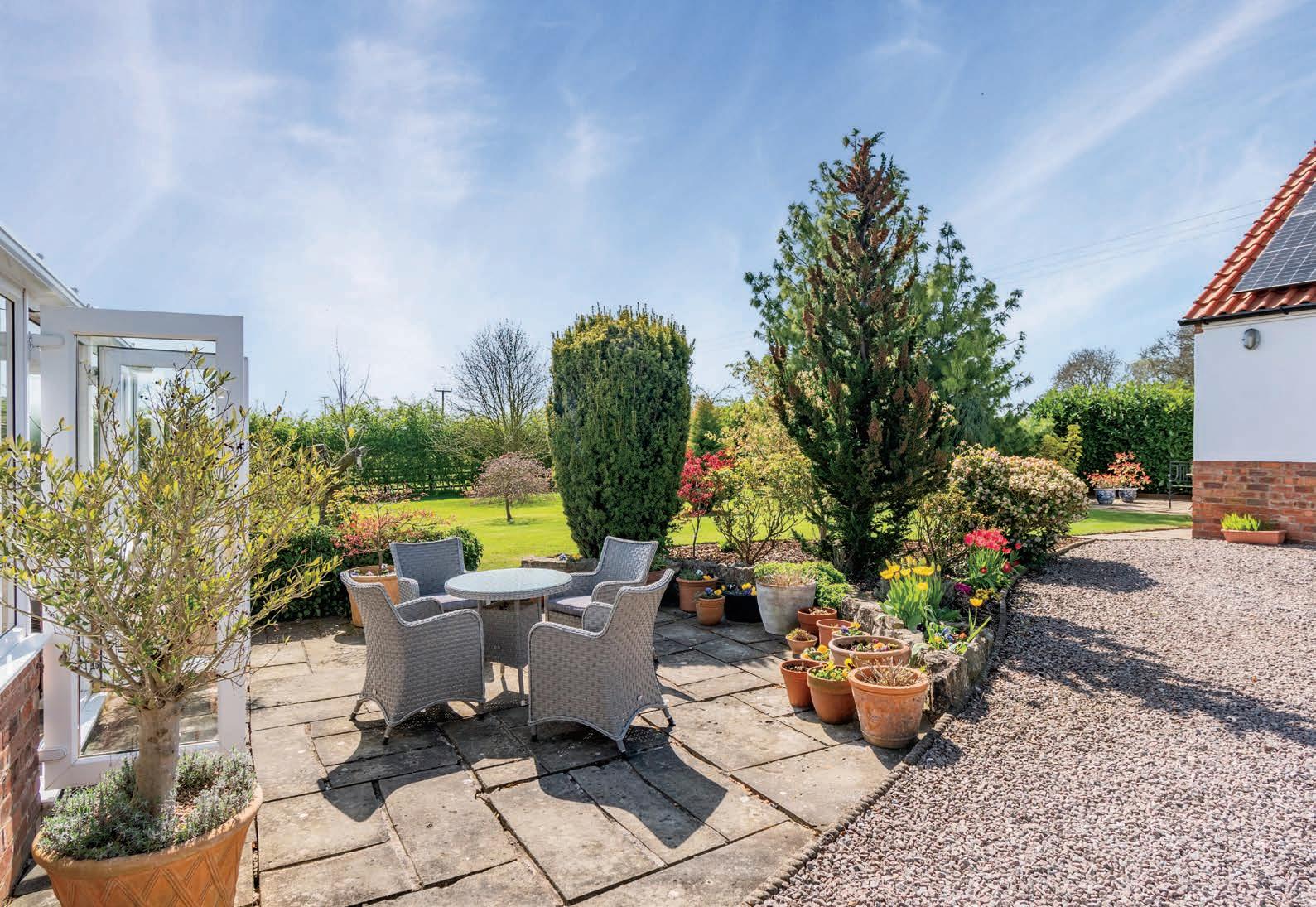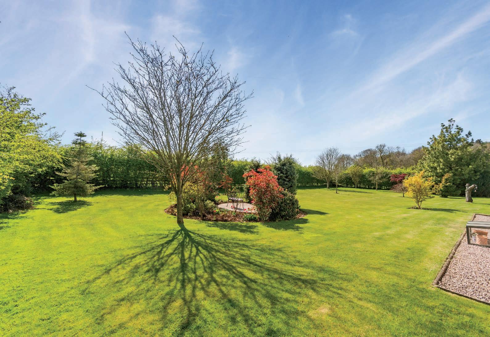 Electronically operated timber gates open to a gravelled driveway which extends beyond the property to a parking area at the rear before gaining access to the triple garage. To the front of the house, set behind a brick wall and hedged boundary is a lawned garden which extends to the main garden area at the side and rear of the property which enjoys a south / southwest facing aspect. At the immediate rear of the house a flagged terrace adjoins the garden room and is slightly sheltered by established trees and landscaped beds; the garden in the main is laid to lawn, has a secondary patio area, and circular shaped planted beds with a feature central patio, all enclosed within a treelined, and hedges borders and extends to approximately ½ an acre.