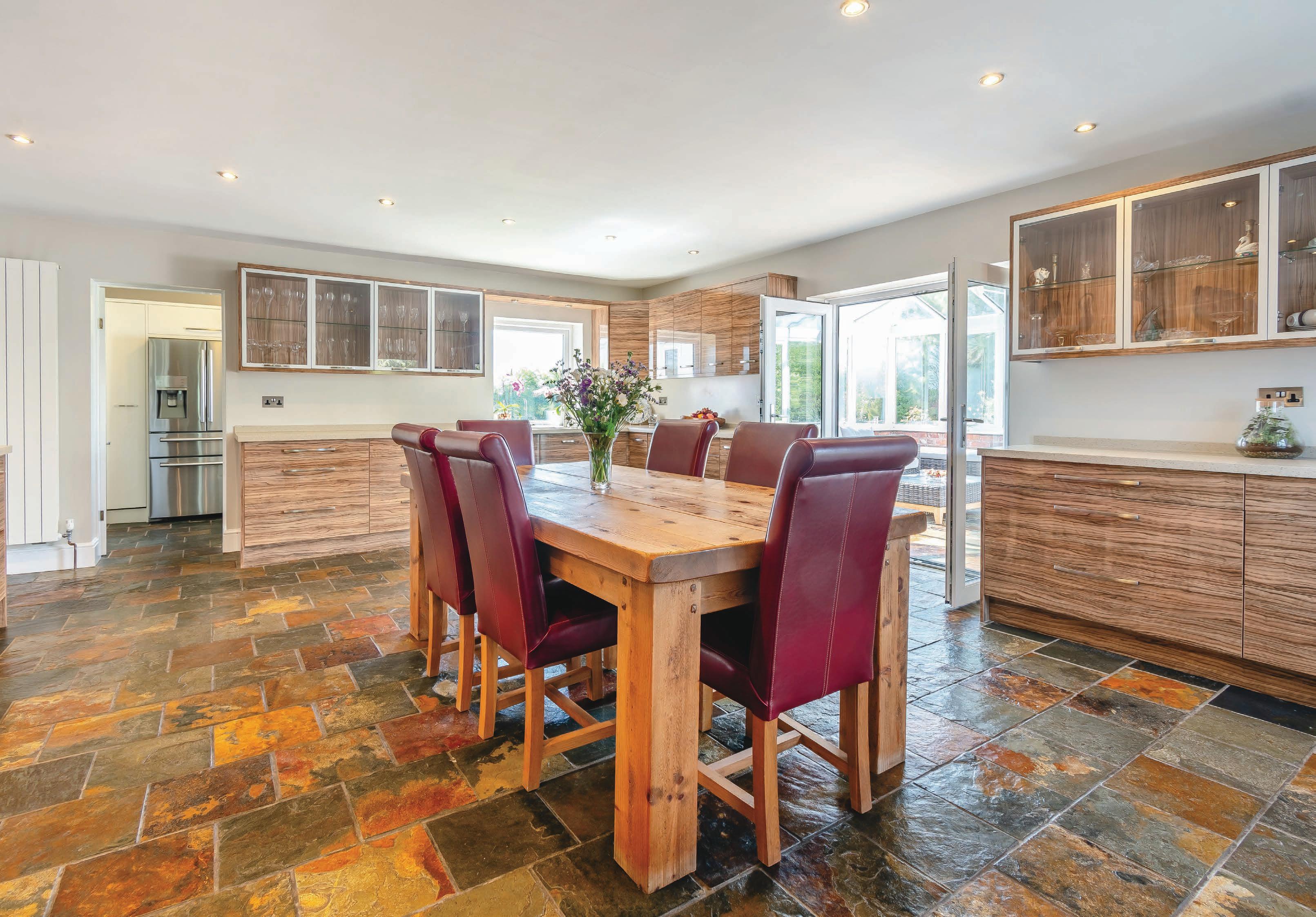 An adjoining utility has furniture with a worksurface and an inset sink, two windows, full tiling to the floor, plumbing for an automatic washing machine and a dryer, and within the units, a larder style fridge freezer.