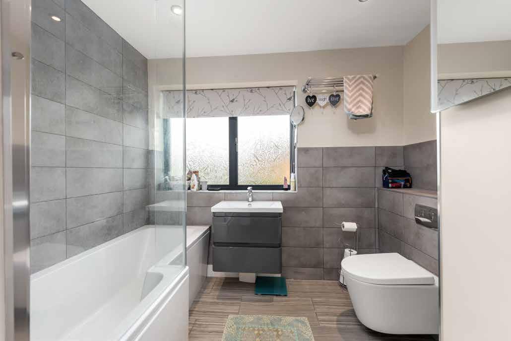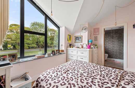 The four bedrooms are all doubles with the master in the new extension, a fantastic length stretching front to back and incorporating a fully fitted en suite with a roll-top bath and room for a dressing area to one side. Both this and the adjoining second bedroom benefit the large trapezoid windows up to the roof, the vaulted ceilings a fascinating shape of intriguing angles, particularly in the master. The second bedroom benefits an en suite shower and the family bathroom serves the other two at the back. All the showers in the house are very large, walk-in and fully tiled.