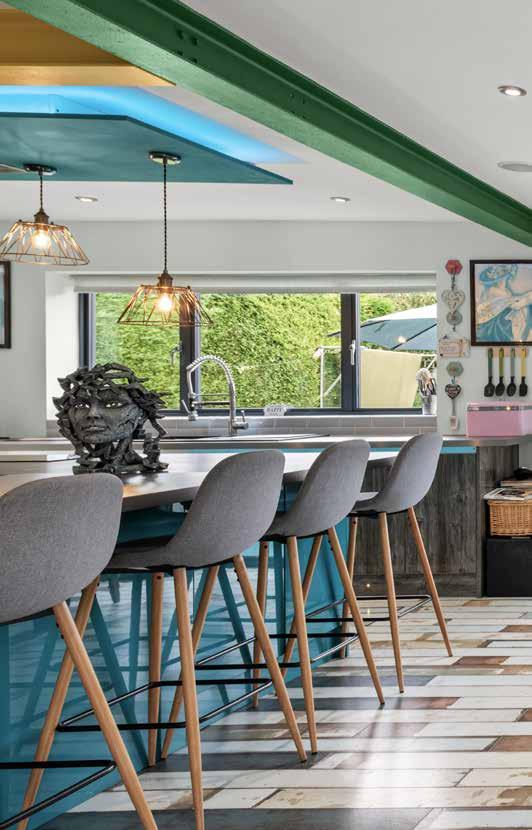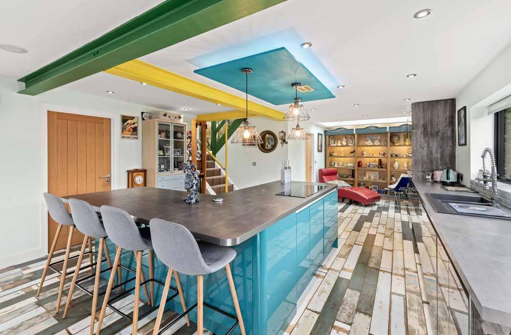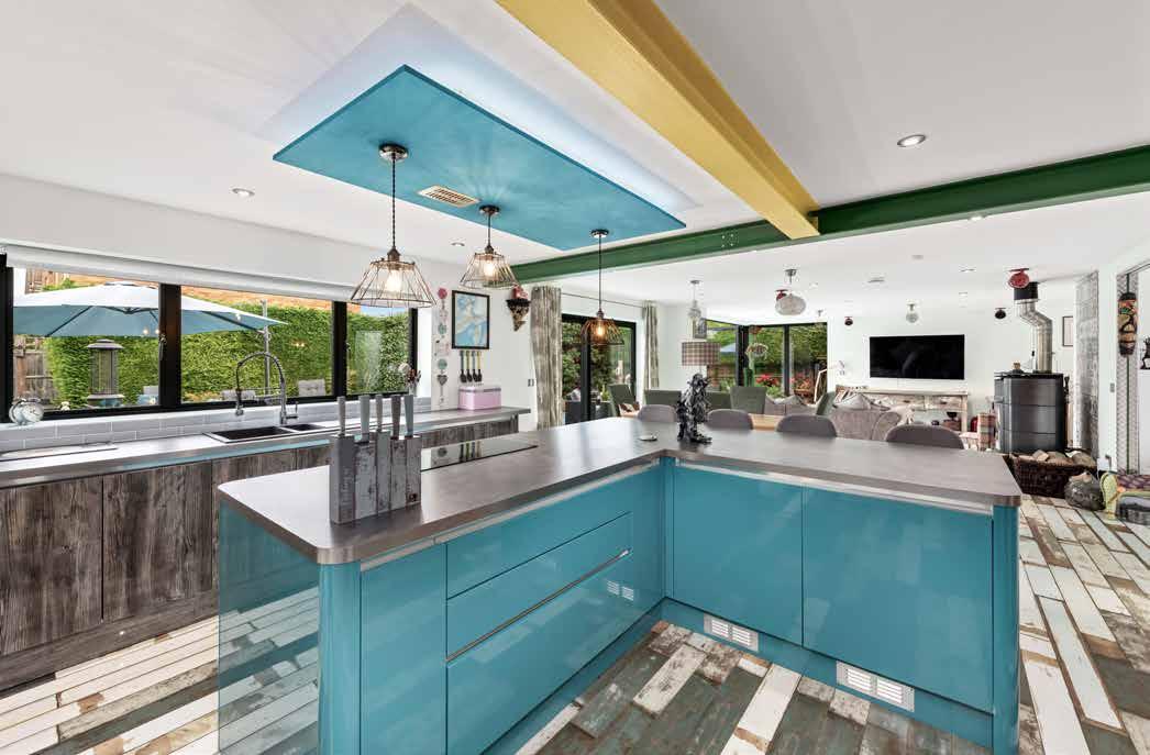 Sitting on a corner plot on a residential road running parallel to the tree-lined main road, an angled low brick wall denotes the front boundary where a wide, blockpaved drive offers parking for two cars in front of the garage adjoining further space on some decorative gravel. Stepping inside through the contemporary entrance, a vast living space opens out before you, the garden visible beyond. “We had to live elsewhere initially as it was such a major project,” say the owners who came here seven years ago and created this highly individual home. “We extended out to the side, removed internal walls, changed all the windows throughout, fitted a new kitchen, contemporary bathrooms and new flooring with underfloor heating in the entire house. The idea, certainly downstairs, was to create an industrial feel but with a homely sense.” The introduction of strong colour forms an exciting dynamic: deliberately visible, juxtaposed overhead green and yellow steel beams combined with the teal-coloured, L-shaped island, mirror the colours of the hedge and decking outside enhancing the connection with the garden. High-gloss units that pick up the textures and colours of the floor, are in abundance and incorporate two integrated Neff eye-level ovens - one a combi microwave with warming drawer below - a Neff induction hob with state-of-the-art extractor over, a fridge, a freezer and a dishwasher. “It’s great to have such a big island that holds so much storage and the breakfast bar is really handy, especially for feeding children,” remark the owners.