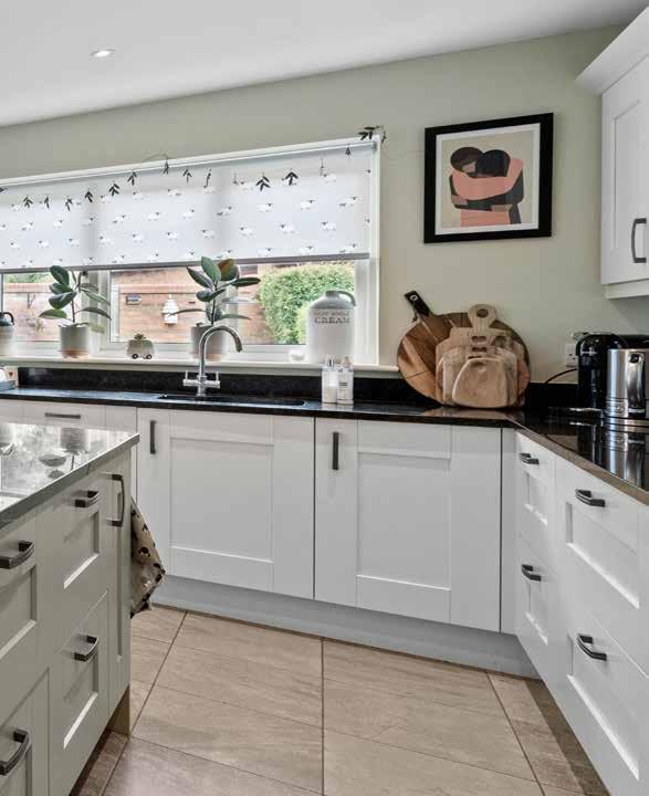 inviting ambiance for culinary pursuits and entertaining. The kitchen area itself is a testament to both style and functionality, featuring an abundance of ivory-coloured Shaker-style units, adorned with sleek black granite worktops, and a substantial matching island. The integrated appliances, including an eyelevel oven and microwave, a gas hob with a glass cooker hood, and a fridge freezer, further elevate the kitchen’s appeal.