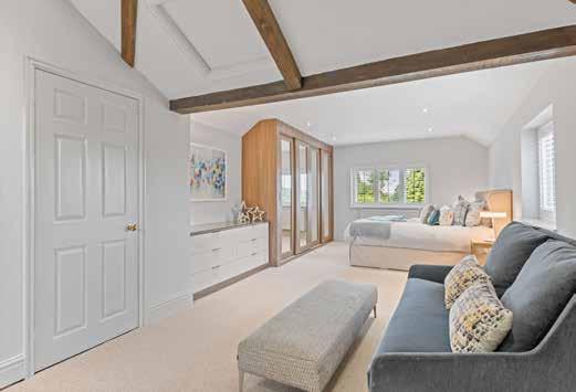Moving upstairs, a huge picture window on the landing is an amazing place to sit and admire the far reaching views across the garden and fields as the land falls away down the hill to the south. Two of the five bedrooms are of exceptional proportions, measuring approximately 35 feet front to back, and very luxurious, both with full en suites and built-in wardrobes; the principal one also benefits a Juliette balcony and a large dressing room area. The other three bedrooms share a fully fitted bathroom, one with its own direct access. The already abundant storage is amplified by a huge amount in the eaves along the landings. New carpets throughout the upstairs were laid within the last two years.
