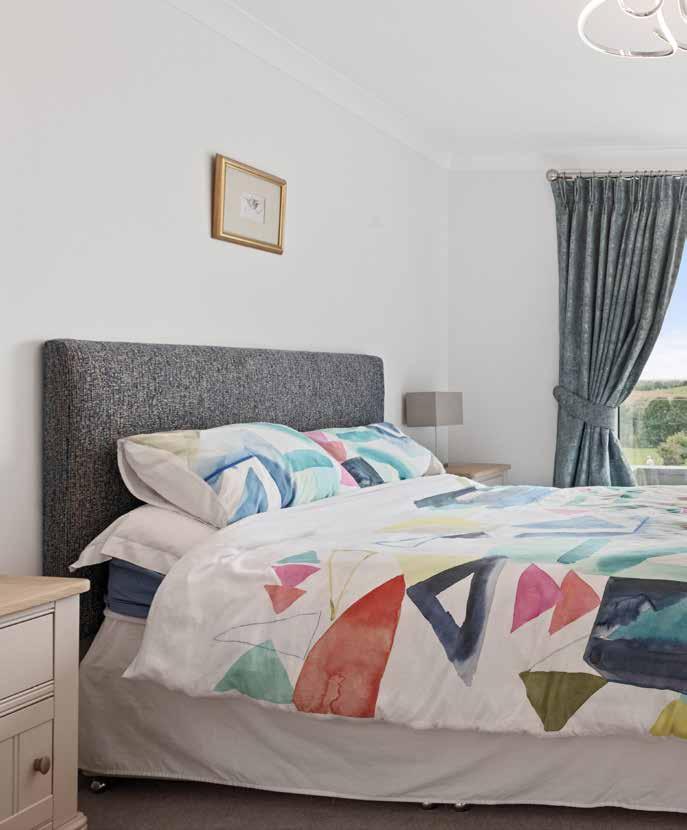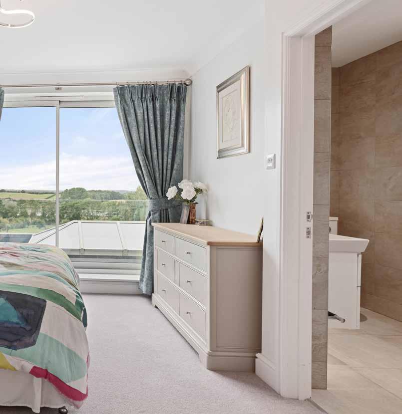 Exploring the first floor, turning right off the stairs, one will discover the first double bedroom, which is dual aspect and features fitted cupboards. Continuing along the landing, there is a new family bathroom, followed by another bedroom with eaves storage. The brilliant primary bedroom has a walk-in wardrobe, further made to measure wardrobe, an en-suite wet room and the most peaceful vista. “We’ll certainly miss laying in bed and looking out of the patio doors in a morning,” the owners said, “seeing the sun rise, the glorious colours and birds flying over. It’s such a beautiful sight. From our bedroom you can see all the way over the reservoir.”