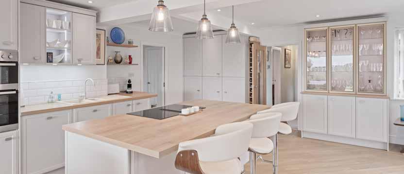 Stepping into the light and bright home, one is welcomed by an entrance hallway with glazed doors, providing you a sneak peak of the property’s stunning Rutland Water views, and a taste of the warm, neutral colour scheme that can be found throughout. Immediately to the right is the dual aspect sitting room, with electric fireplace, whereas to the left is the dining room, followed by the expansive kitchen.