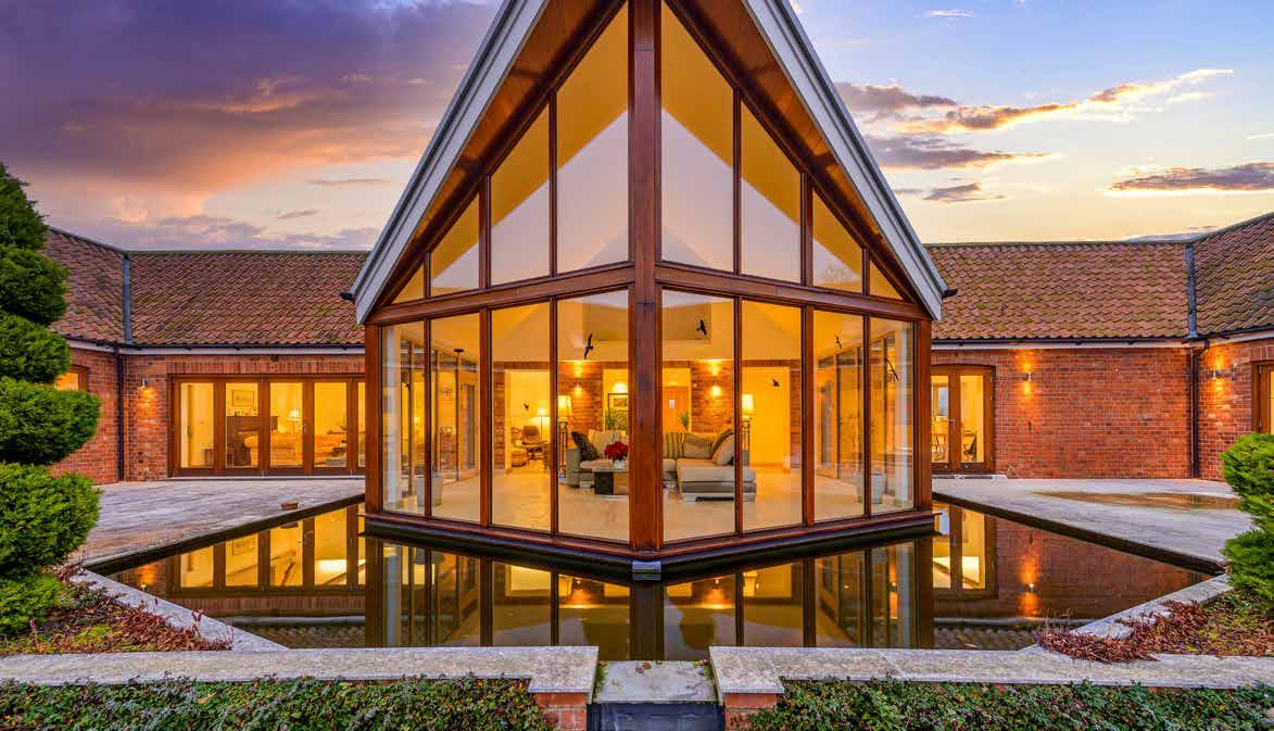 Constructed in a mix of stone and brick with terracotta pantile roofs, the barn is predominantly single storey with an M-shaped footprint that is perfectly orientated for capitalizing on the best of the sunshine. The main entrance is centrally positioned which leads directly into an awe-inspiring, fully glazed, modern extension - the garden room somewhat reminiscent of a ship’s bow from the outside apparently floating on calm waters of the encompassing reflection pool. Projecting into the south facing courtyard around which the barn sits, doors open onto paved terraces either side and bi-folding doors sweep back from both the kitchen and the principal living room forming a seamless flow between the inside and out.