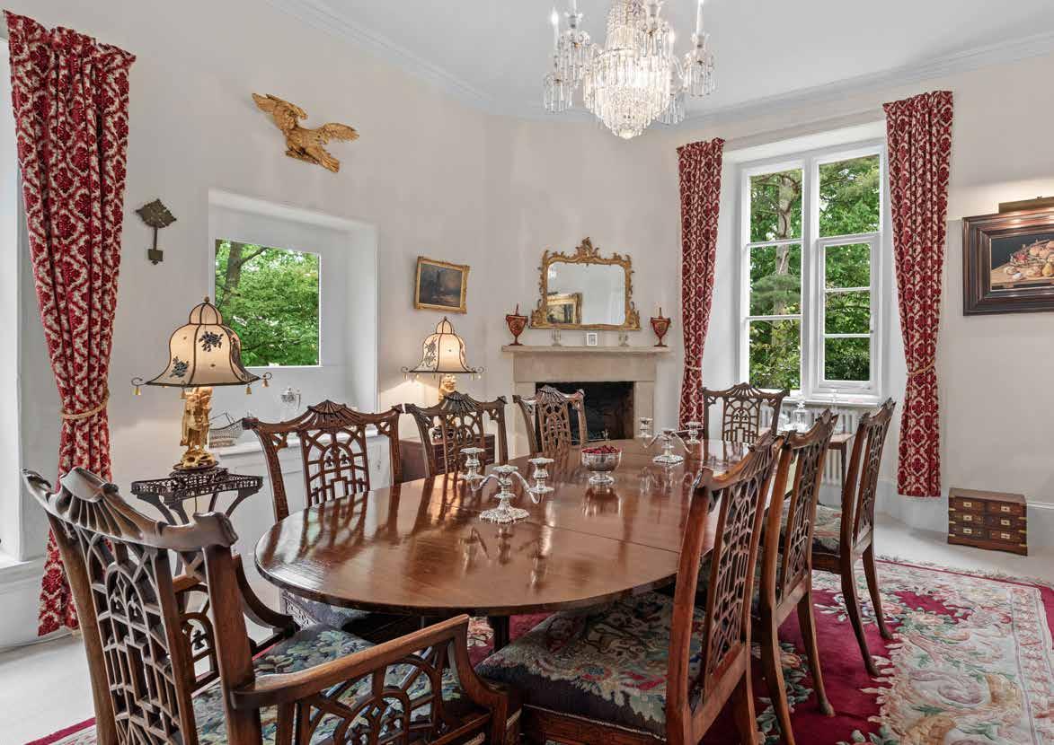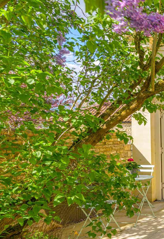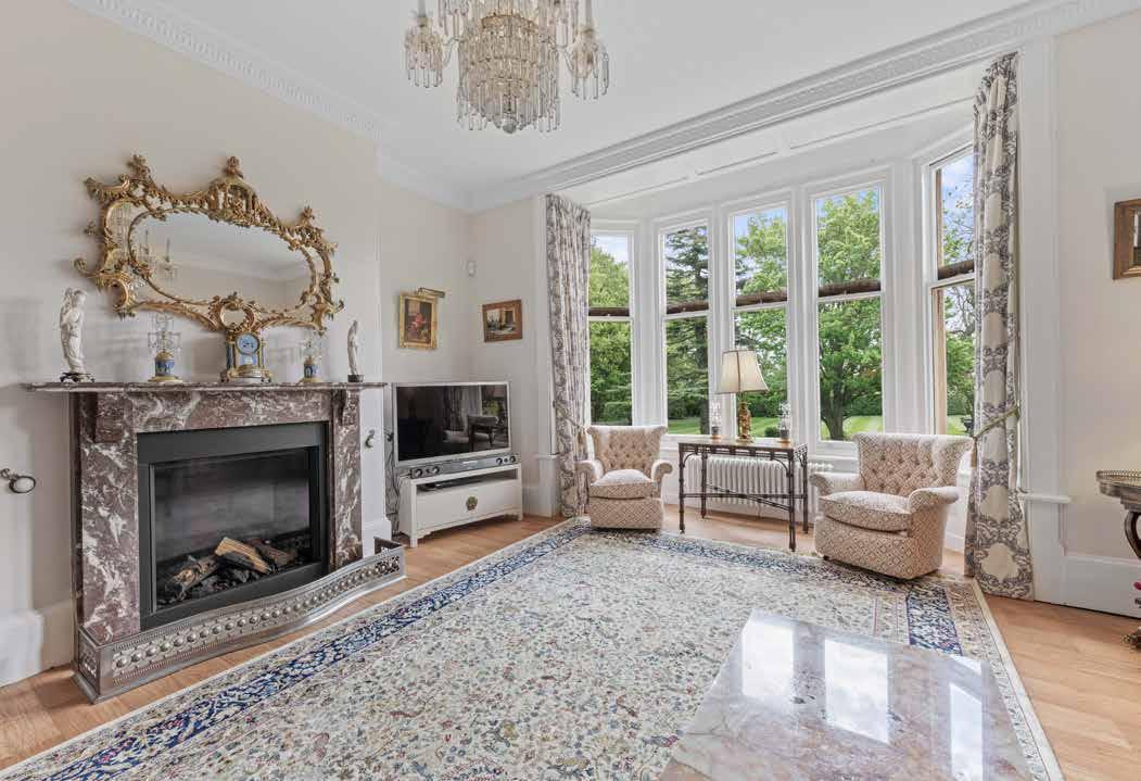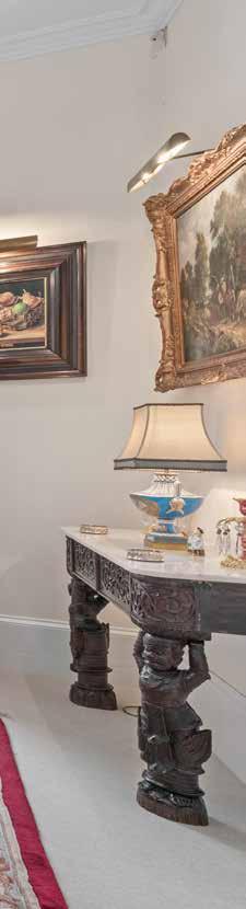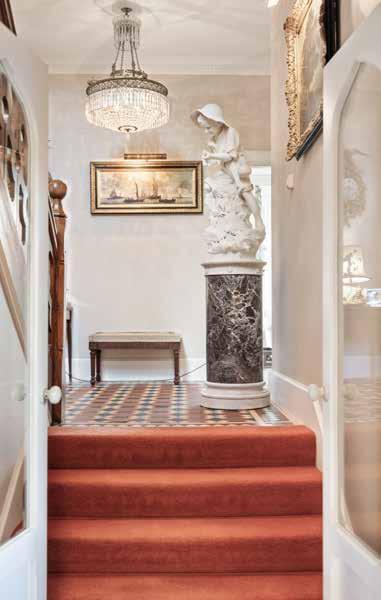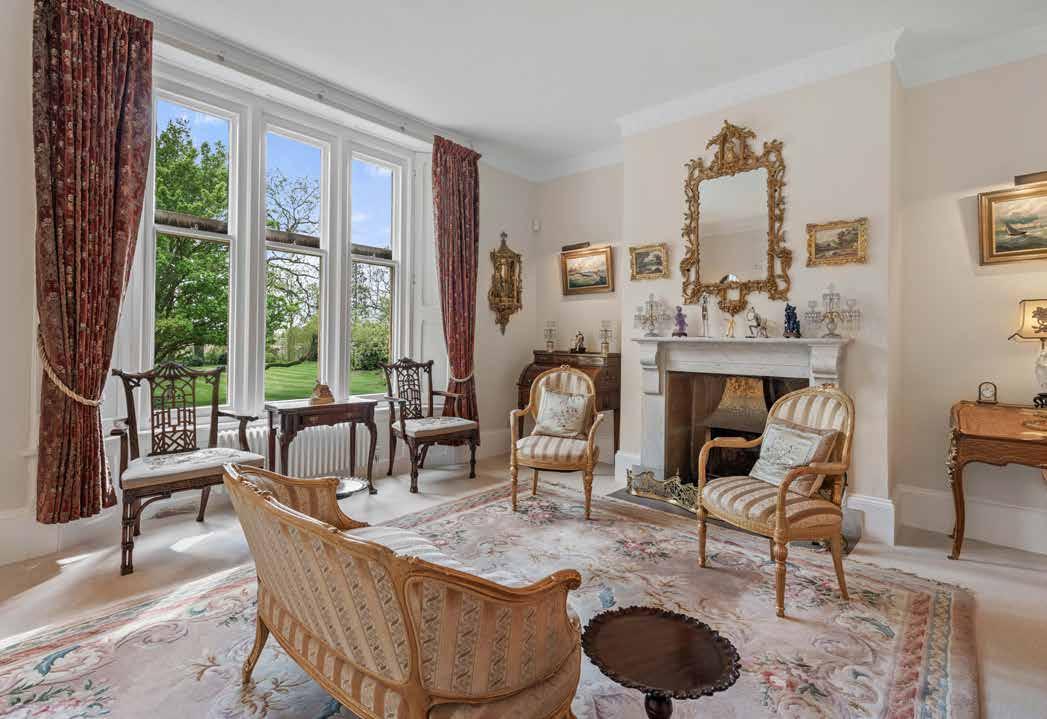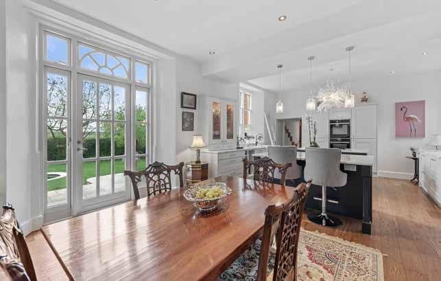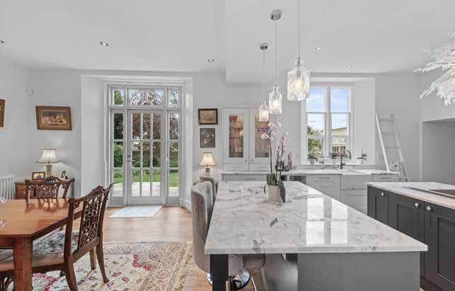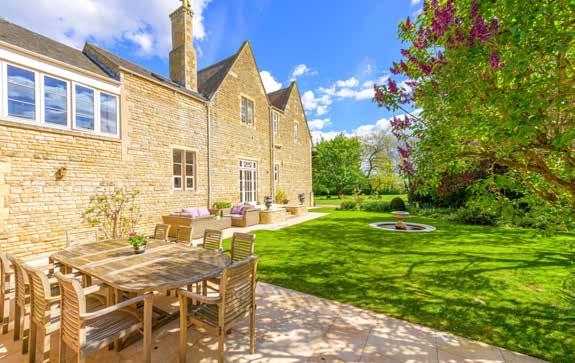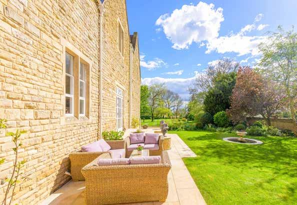 features with high ceilings, huge sash windows, internal shutters, marble and stone fireplaces, even the old servants’ bells. “The original manor house is said to have burnt down but its stones were used to build this house,” says the owner who has lived here for thirty years. “We resurrected from dereliction the oldest part, the red rick brewhouse building built around 1780, and connected it to the main part when we first came here. More recently, we opened up the kitchen and breakfast room to create a lovely, big, open plan space where a door opens onto the sandstone terrace. This south and west facing area has been a wonderful outdoor entertaining space that leads to the old vinery which has underfloor heating, a central lantern, infra-red lighting in the ceiling and a television point. It’s a superb outside room with glazed doors that fold right back and you can see all the way down the garden. A nice feature outside is one of the old millstones from the original manor house embedded in the garden wall here.”