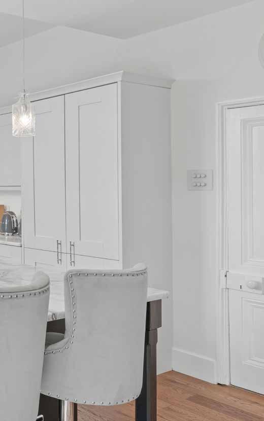 A panelled pink door welcomes you in to a rear hall with steps leading up to the striking Victorian entrance hall whilst a door on the right takes you into the superb, refurbished and very refined open plan kitchen dining room. Virtually the whole property has had a complete refurbishment towards the end of 2020. As the owner informs, “We knocked down the wall between the old breakfast room and the kitchen to create this lovely space which leads onto the garden. The fitted kitchen is a high quality one with beautiful quartzite worktops, predominantly pale but with very subtle touches of pinks and yellows within the greys, and the cupboard doors have unusual elegant chrome handles.”