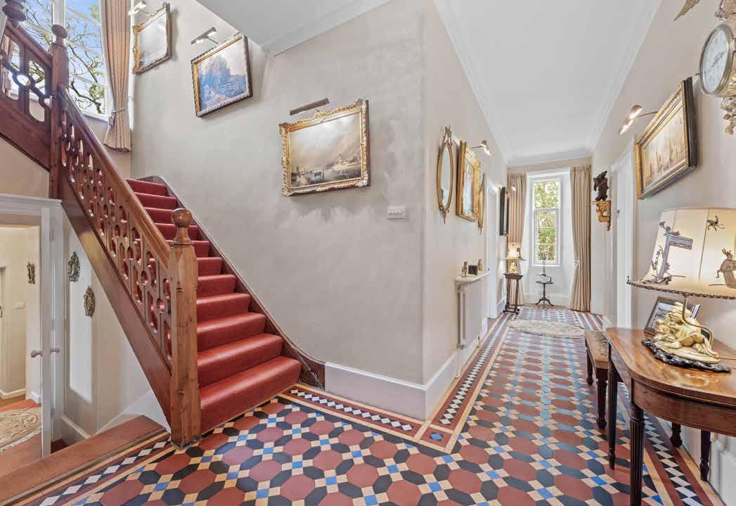 In an elevated position with steps leading up to the original front door under a delightful porch, the main part of the house, built between 1860 and 1870, has a striking Victorian tessellated tiled hall and is full of original period
