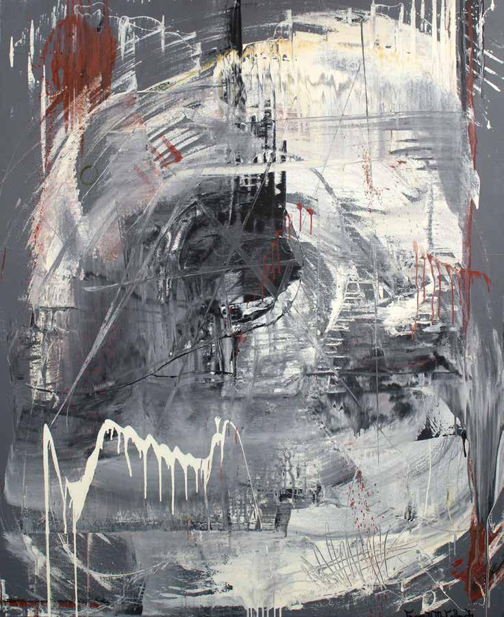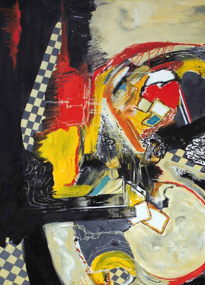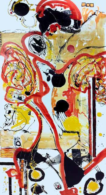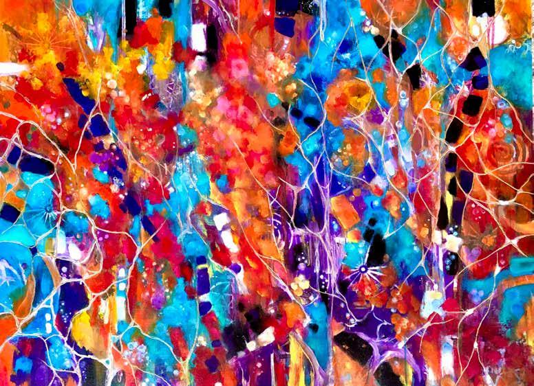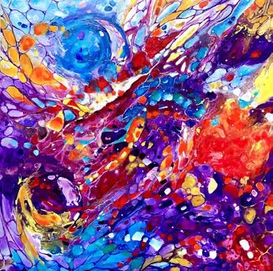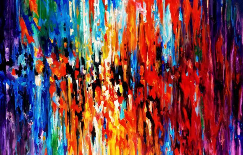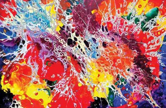 about anything and everything. As a youth he was always taking things apart and creating gadgets with a new purpose. On into his teens he was often found in the shop working on vehicles and projects. Jeff is a lifelong Motocross rider and demolition expert, so looking at the action involved in making beautiful art from a chaos resonates — as the poet philospher Eli Siegel so aptly put it, “Beauty is the making one of opposites.” Sometimes the bike crashes but as a winning racer, Jeff knows how to make that blend work. In his very unique version of abstract art — “Abstraction Unbridled” — that dynamic is quite evident and has been since he started his business he said of it, “We had a company, we built up to where we had 45 employees, excavators, trucks, and a whole crazy operation. We were doing some charity work for a children’s hospital where I saw a piece of art that I liked and I thought to myself, I can do that. So I went home and taught myself how to paint. I had a bit of free time and my hobby evolved into my passion and my passion grew. I wanted to go from deconstruction to my creative side. I gave the majority of my work for the first three years to charity. ”